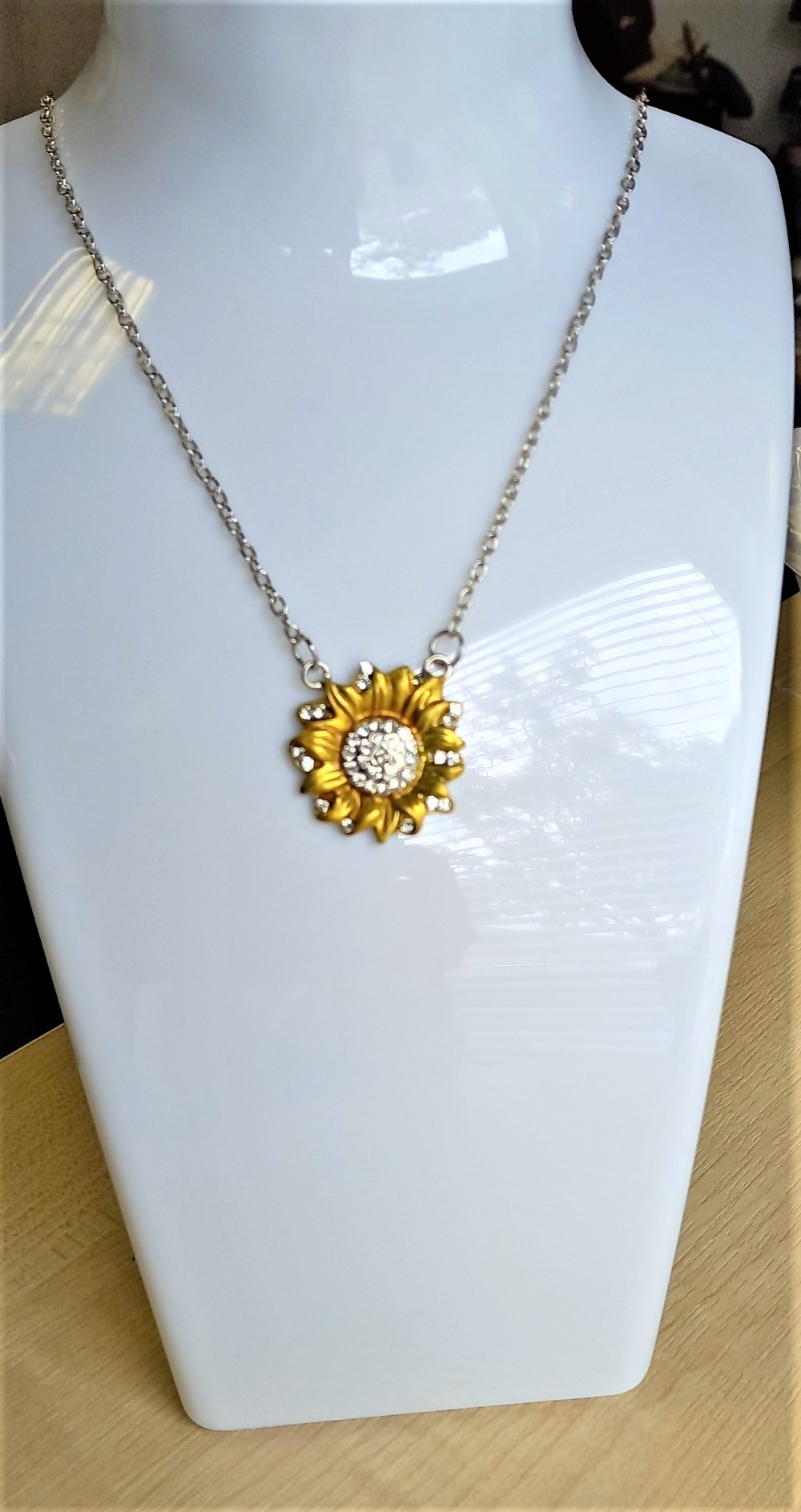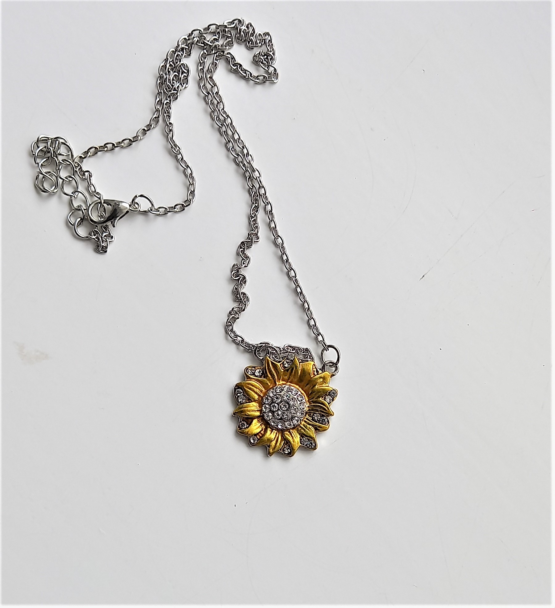This is a gorgeous necklace featuring a sunflower in gold and silver tone with crystals in the middle.