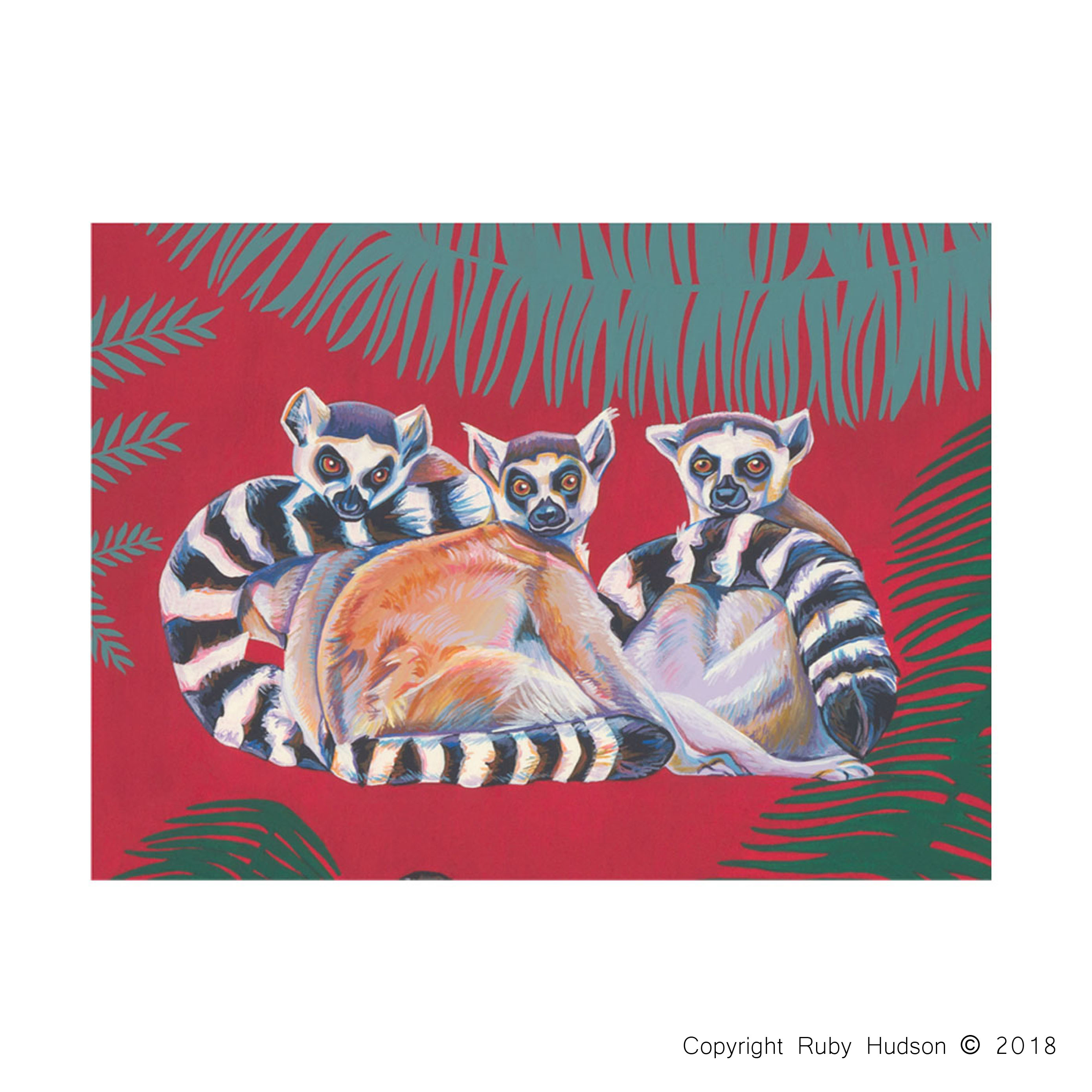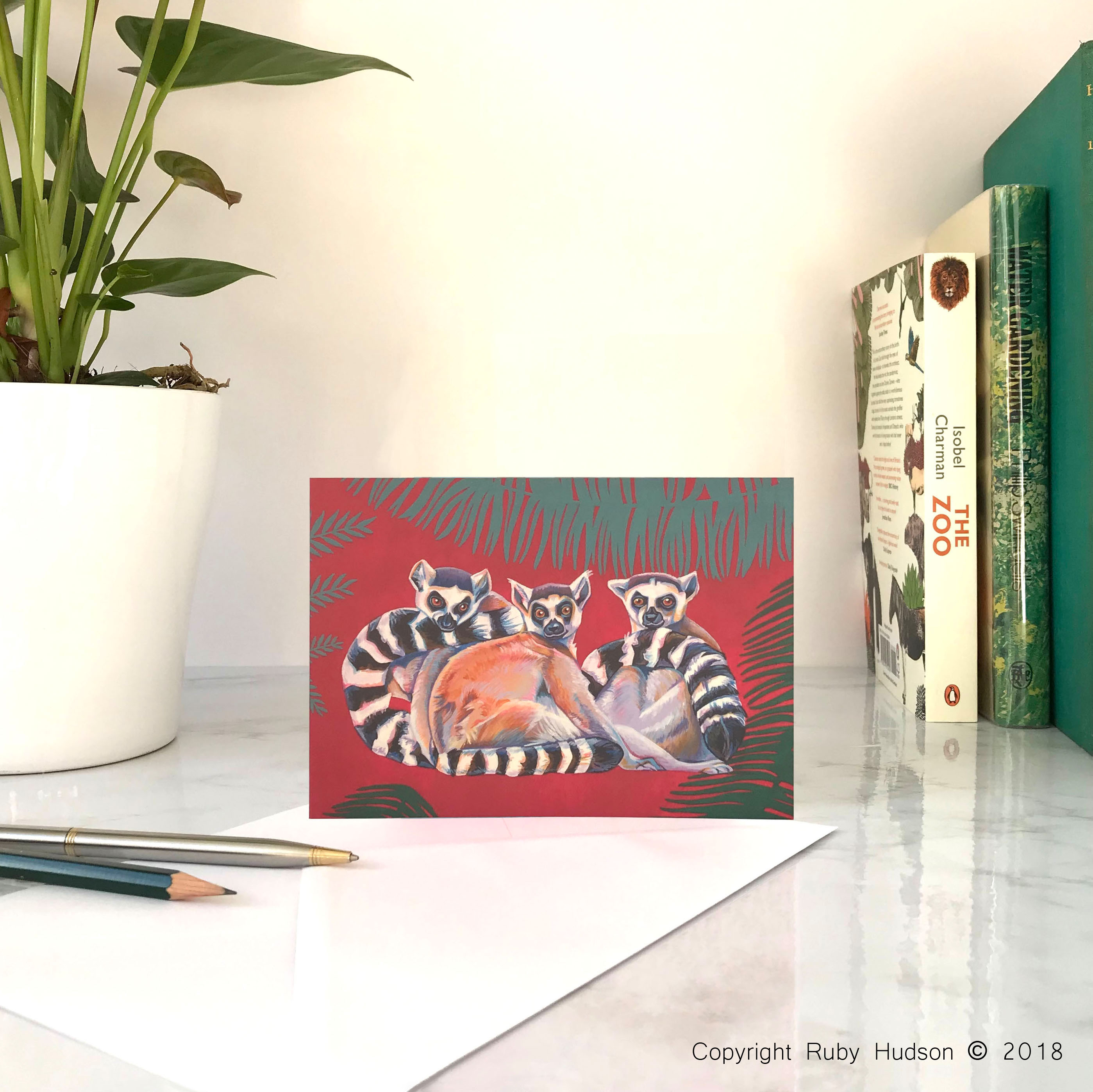 High quality A6 greeting cards featuring a hand painted Lemur troop illustration. Designed and printed in the UK onto thick 350gsm silk matt-laminated card. White envelopes included. Approximate weight per single card unit 16g