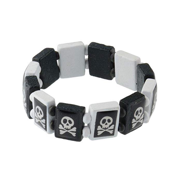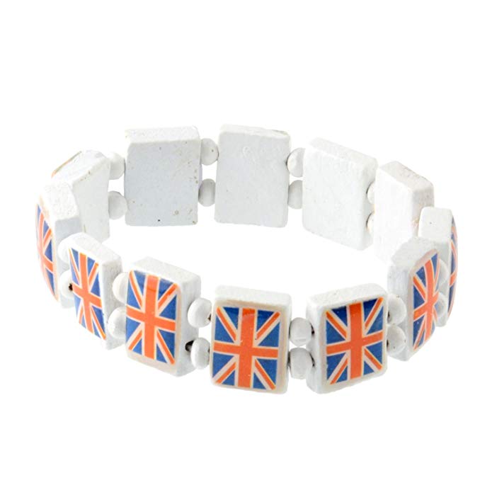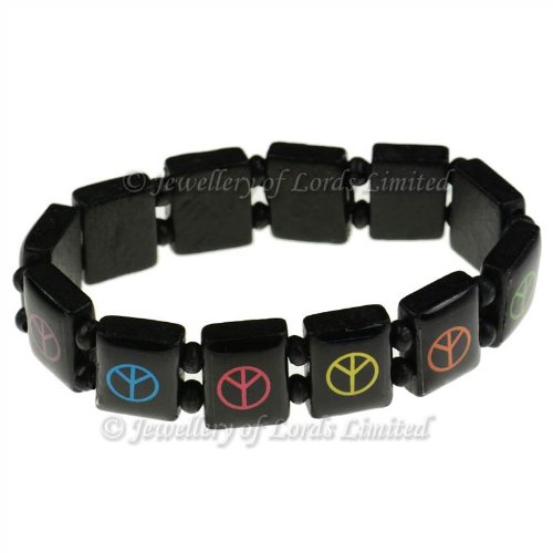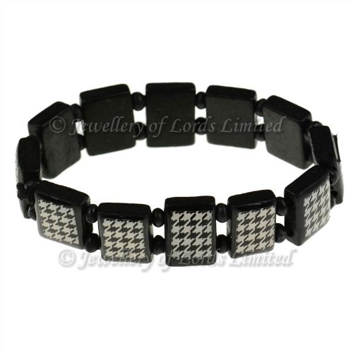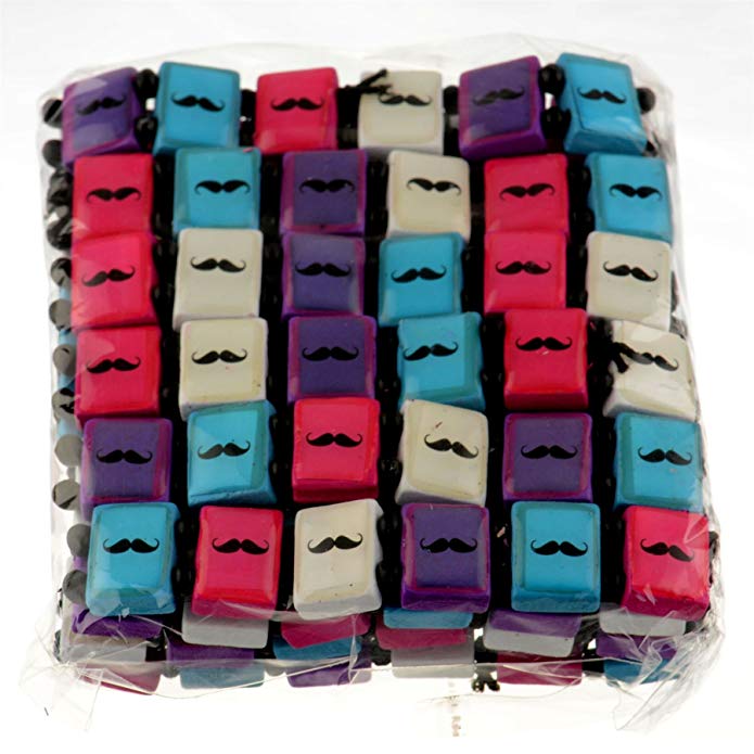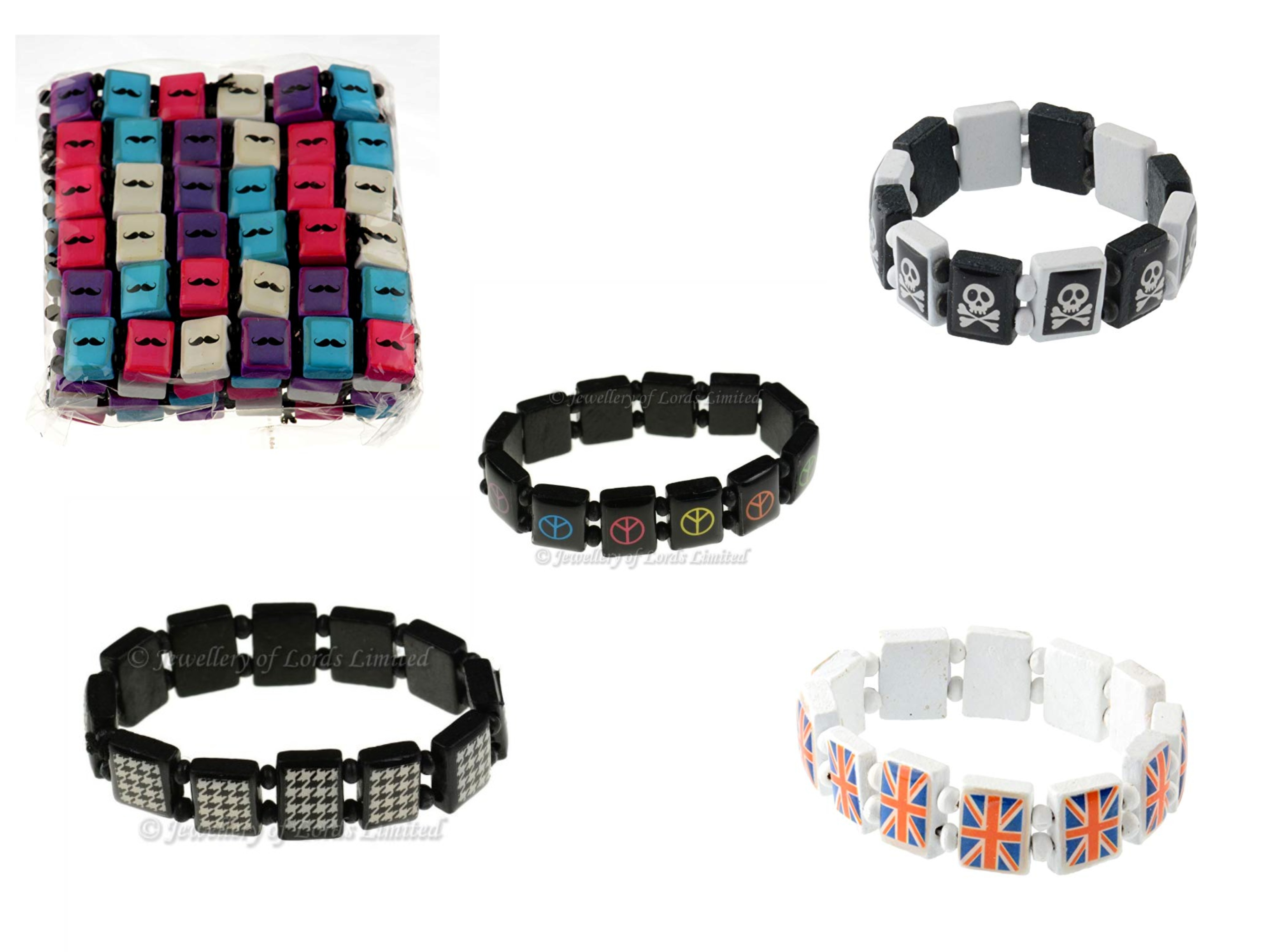 Square wooden coloured beads with either moustaches, dog tooth, union jack, pirate or peace designs. Elasticated and with smaller round beads in between the square ones.