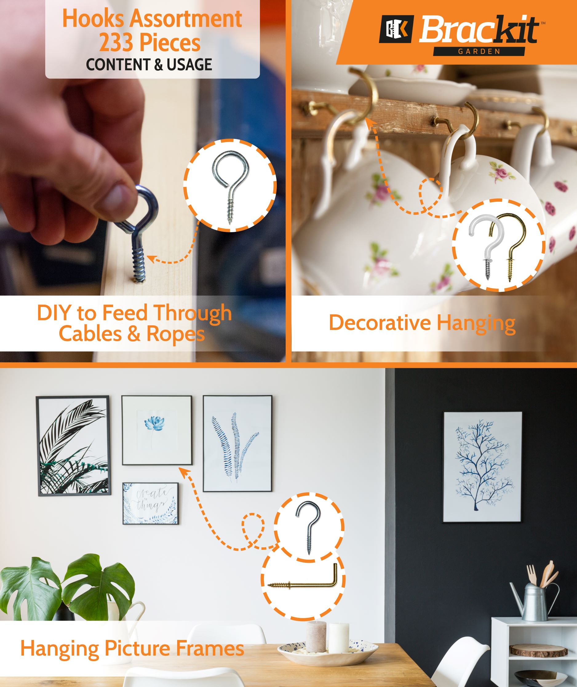 - VERSATILE: The hanging hooks in this kit are multifunctional and suitable for various tasks around your home, bar, kitchen, garden or garage including putting up and displaying photos and pictures, potted plants, string lights, curtains, and other decorative items or tools as well as for hanging household items such as keys, jewellery, mugs, clothes, bags, kitchenware and other sundries to help keep your home tidy