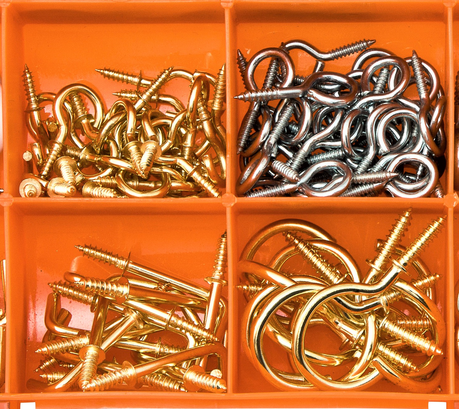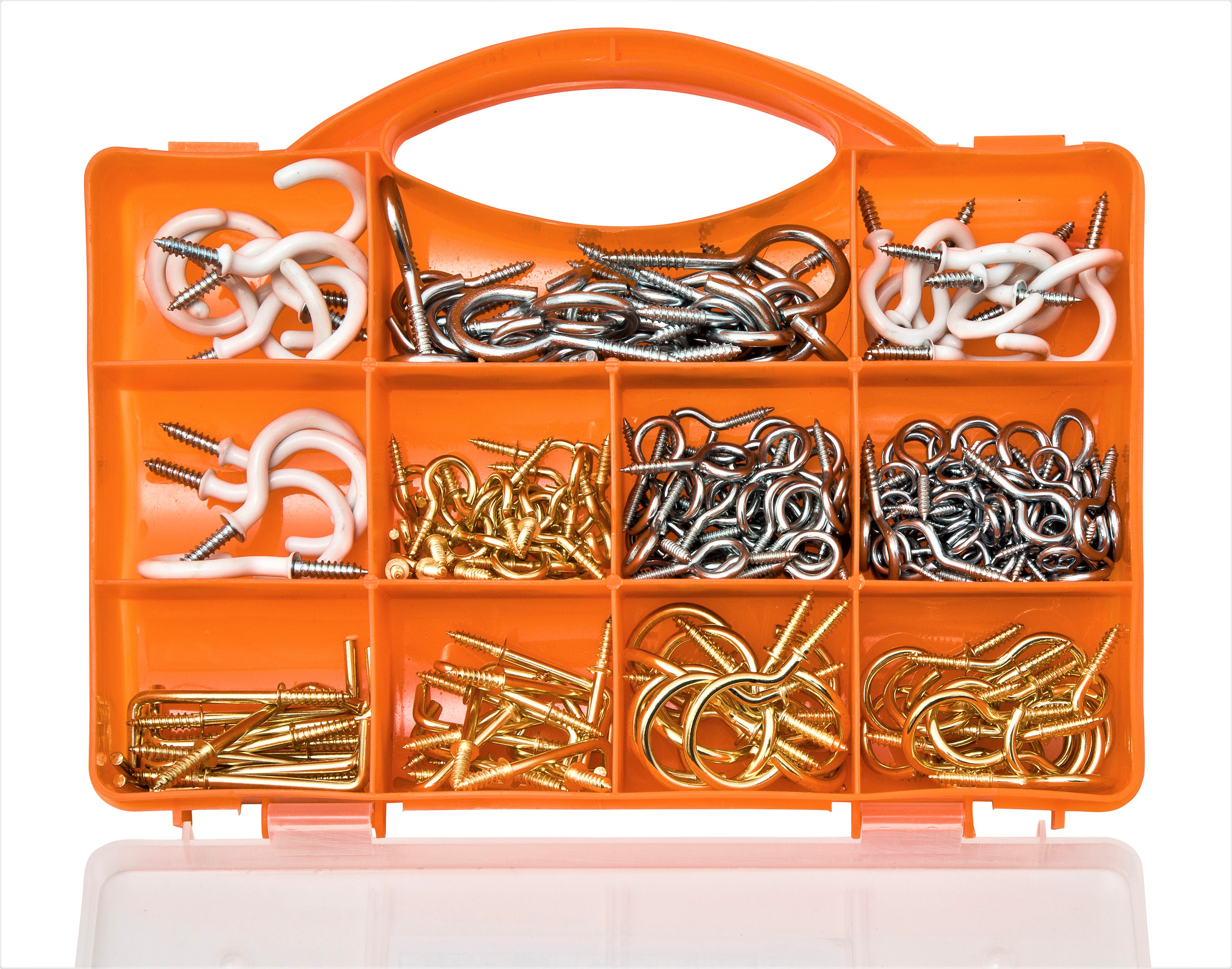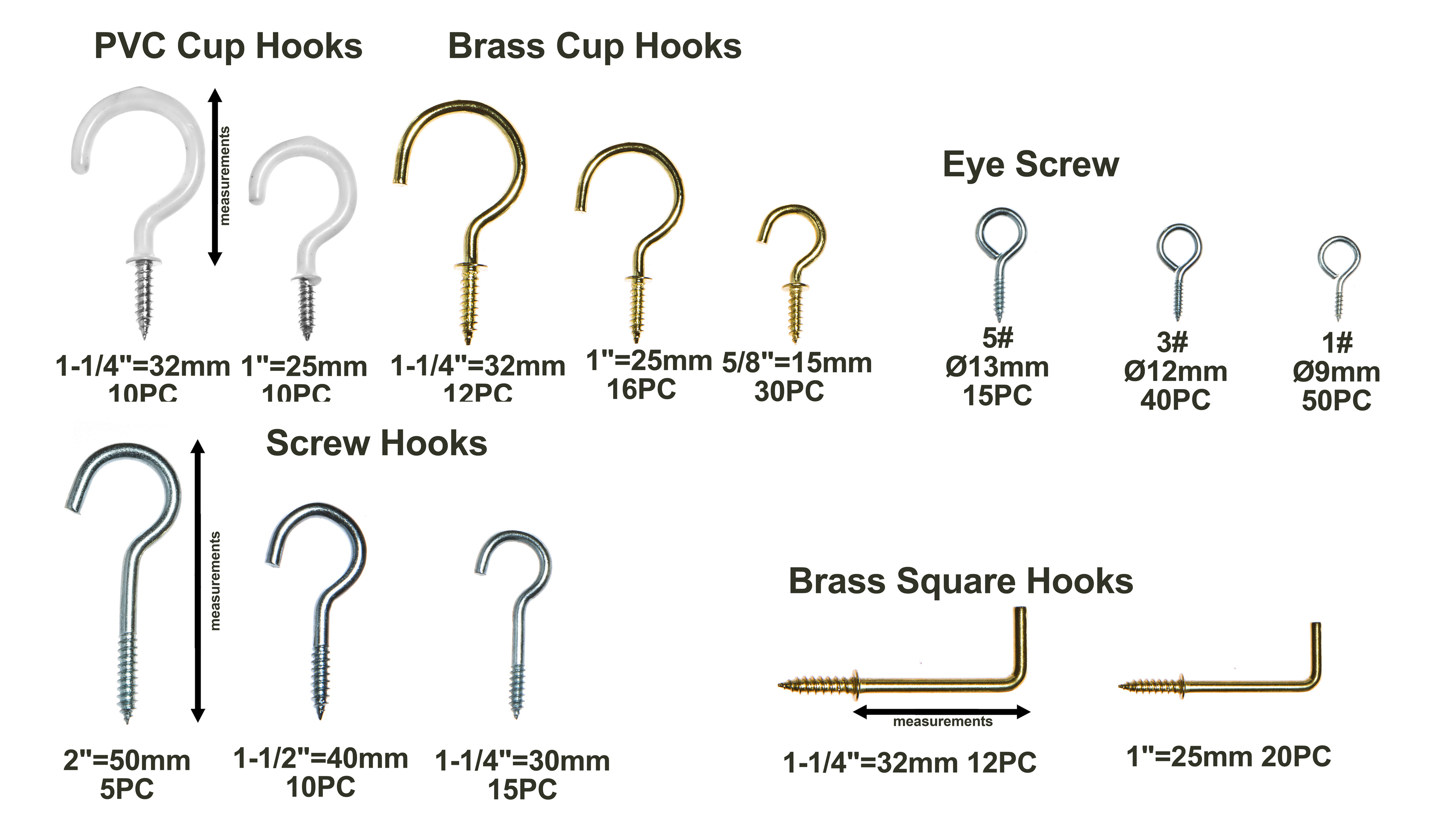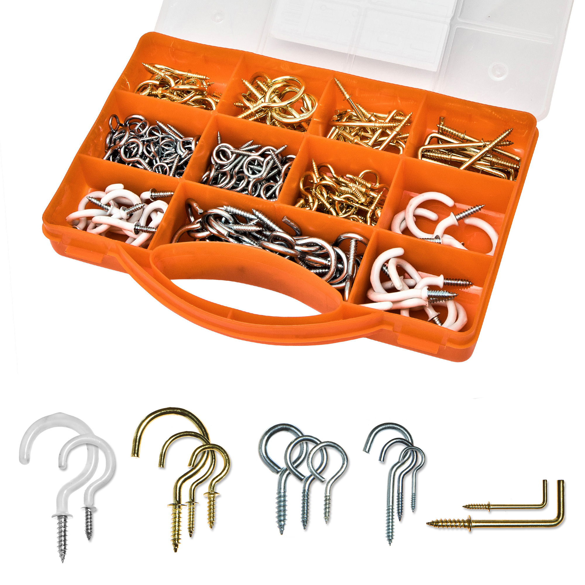- GREAT VALUE: Our hook assortment set includes 5 types of hooks in various sizes - cup hooks, PVC cup hooks, square L hooks, eye screws and screw hooks meaning you’ll always have the hook you need