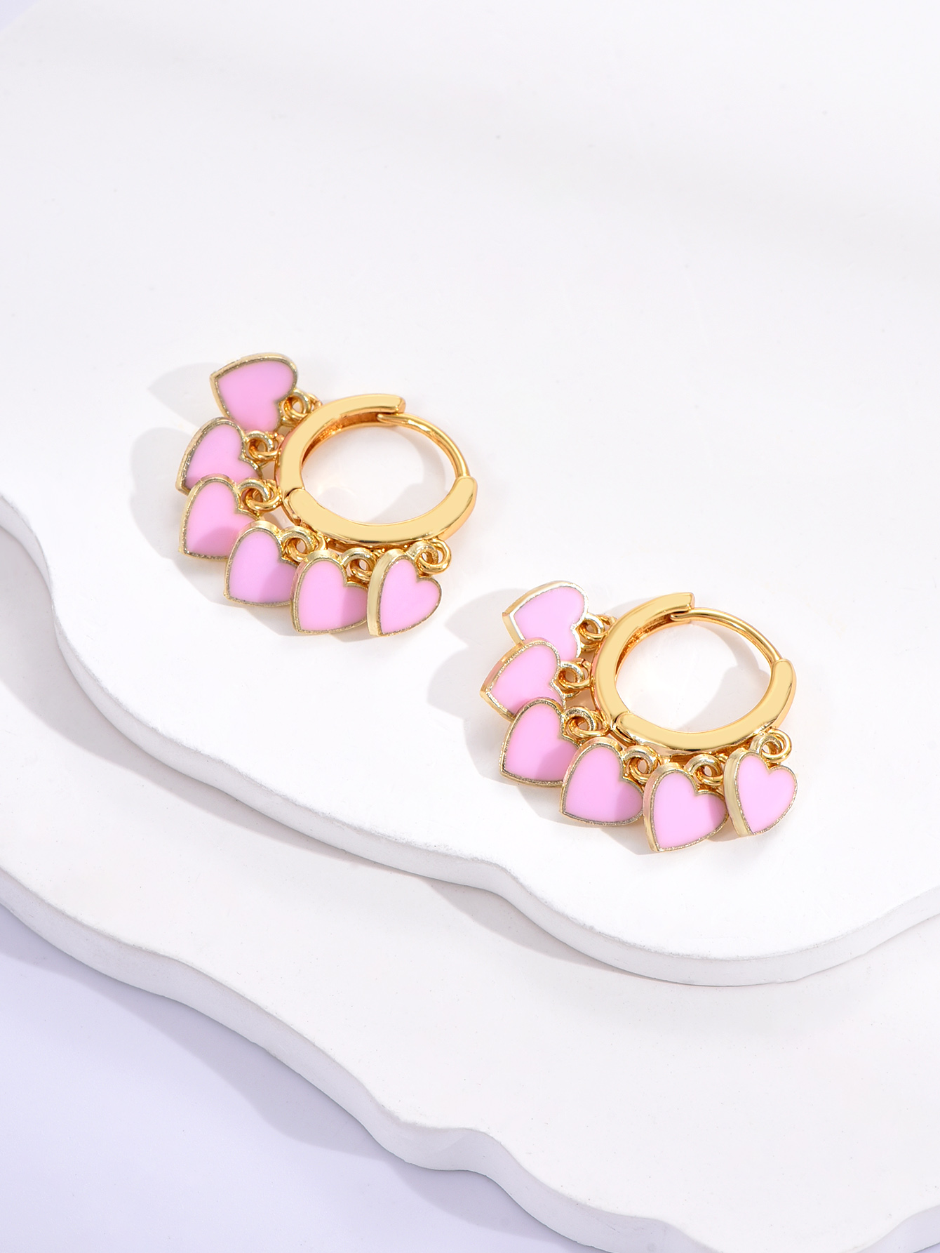 This is cute earring is featuring with tiny delicate Pink hearts charms dangling from a Gold huggie hoop.