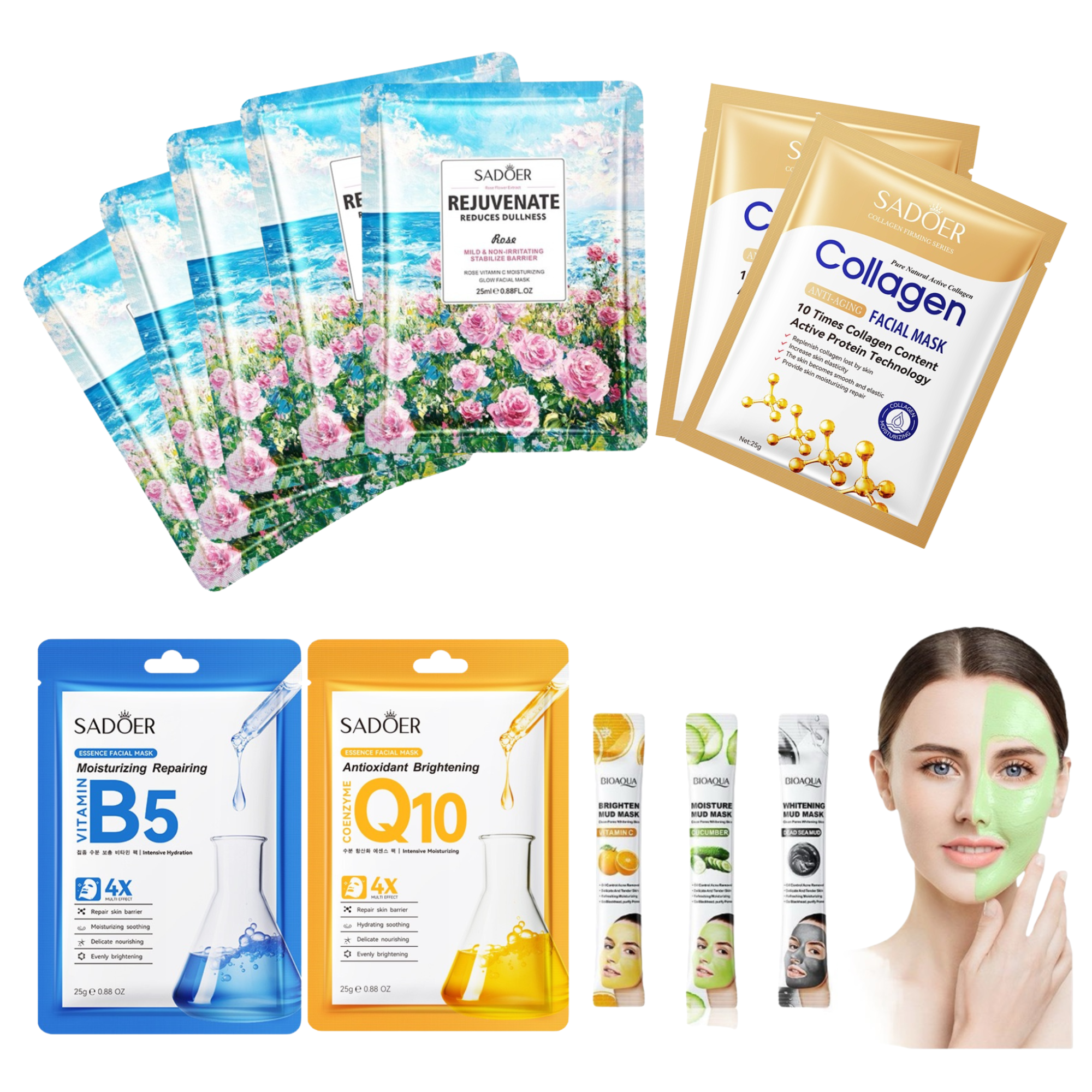 Treat yourself to the ultimate at-home spa day with this comprehensive facial mask set, crafted to hydrate, nourish, and refresh your skin. Each mask is infused with natural, gentle ingredients that work to restore moisture, smooth fine lines, and reveal a healthy, radiant glow.
