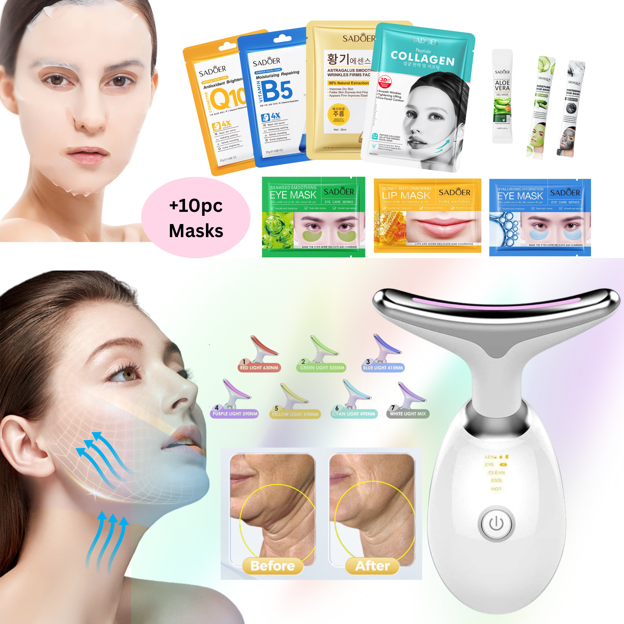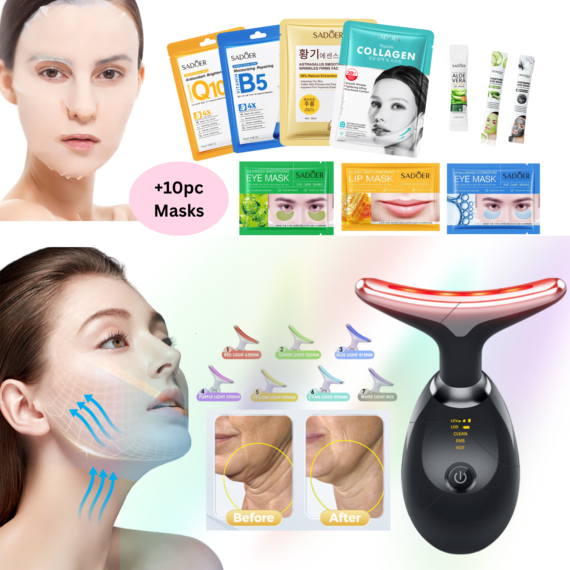 Elevate your skincare ritual with our advanced multi-functional beauty device, now available in your choice of classic White or sleek Black. This comprehensive set comes complete with 10 specialised beauty masks to target various skin concerns, providing a full spa-like experience at home.