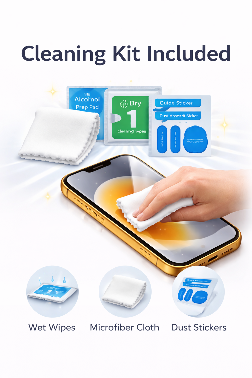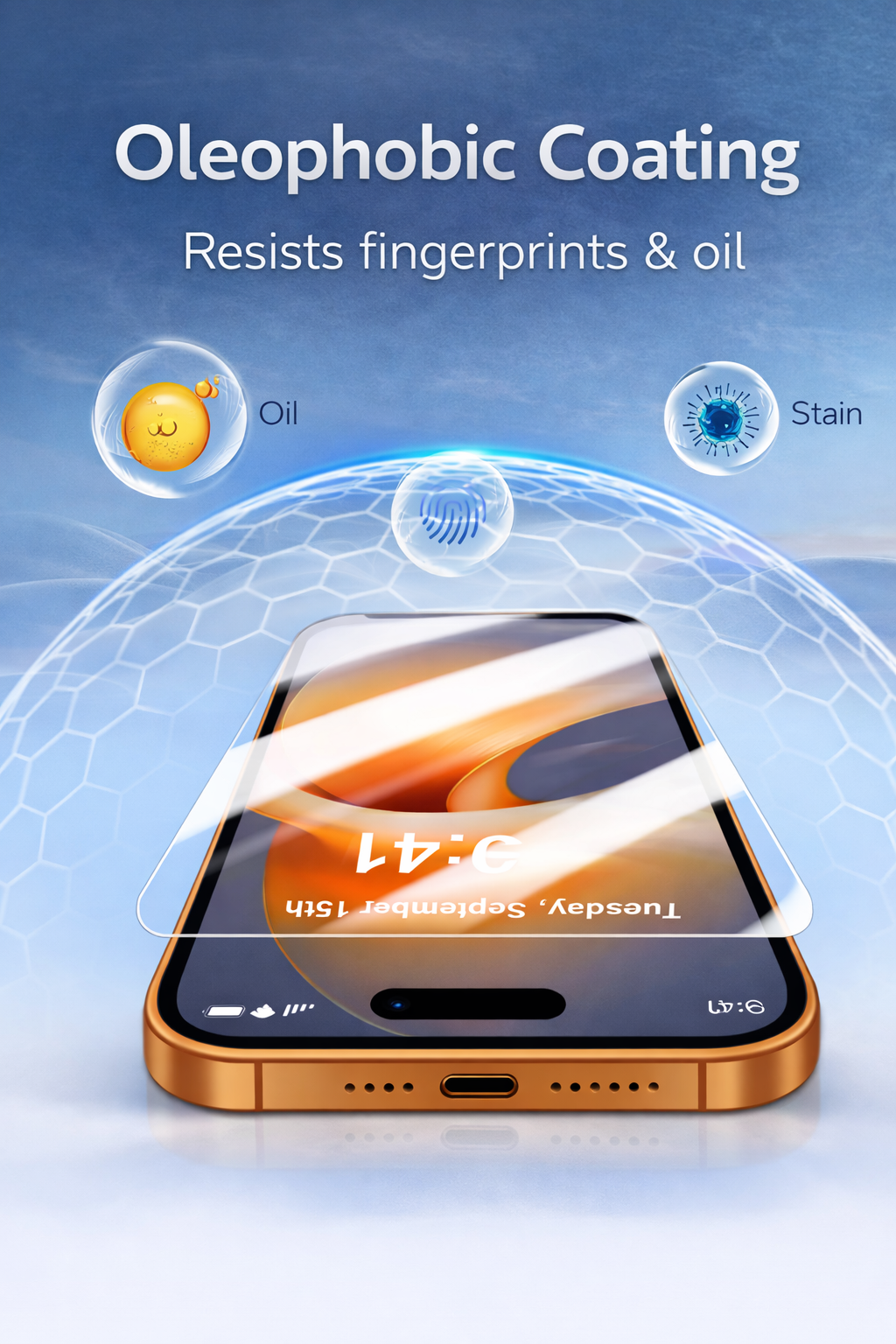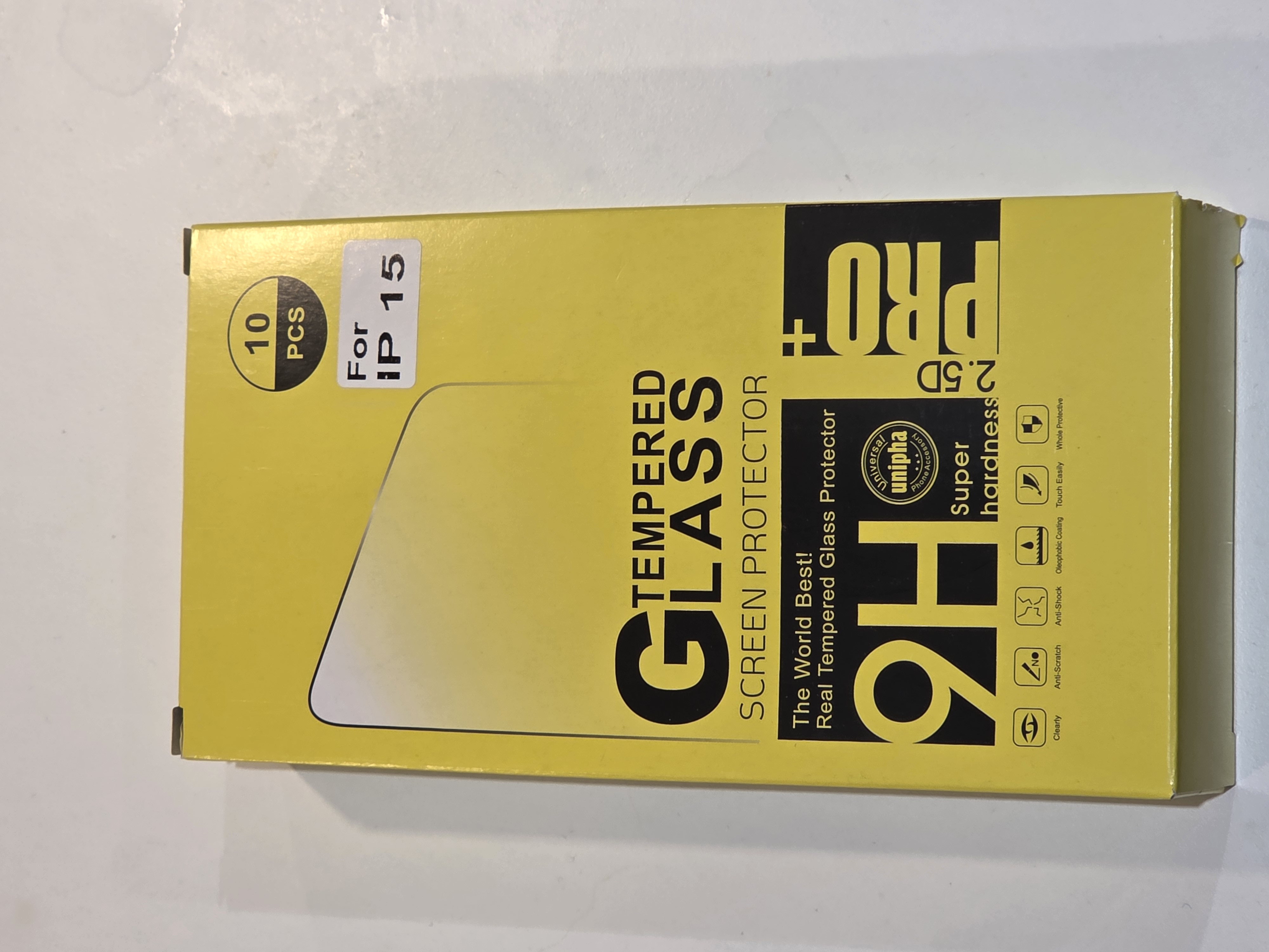 Tempered Glass Screen Protector for iPhone 15 Key features: 9H Hardness Protection Strong tempered glass helps protect against scratches, drops and everyday wear HD Clear Transparency (99.9%) Ensures screen is sharp, bright and responsive Ultra Responsive Touch Smooth, precise touch sensitivity with no lag Full Glue Adhesive Full-screen adhesive ensures a secure fit with no lifting edges Oleophobic Coating Resists fingerprints, oil and smudges – easy to keep clean 2.5D Rounded Edges Comfortable feel with a case-friendly design Easy to apply Comes with a cleaning kit for bubble-free installation In the box: - Tempered glass screen protector - Full cleaning kit