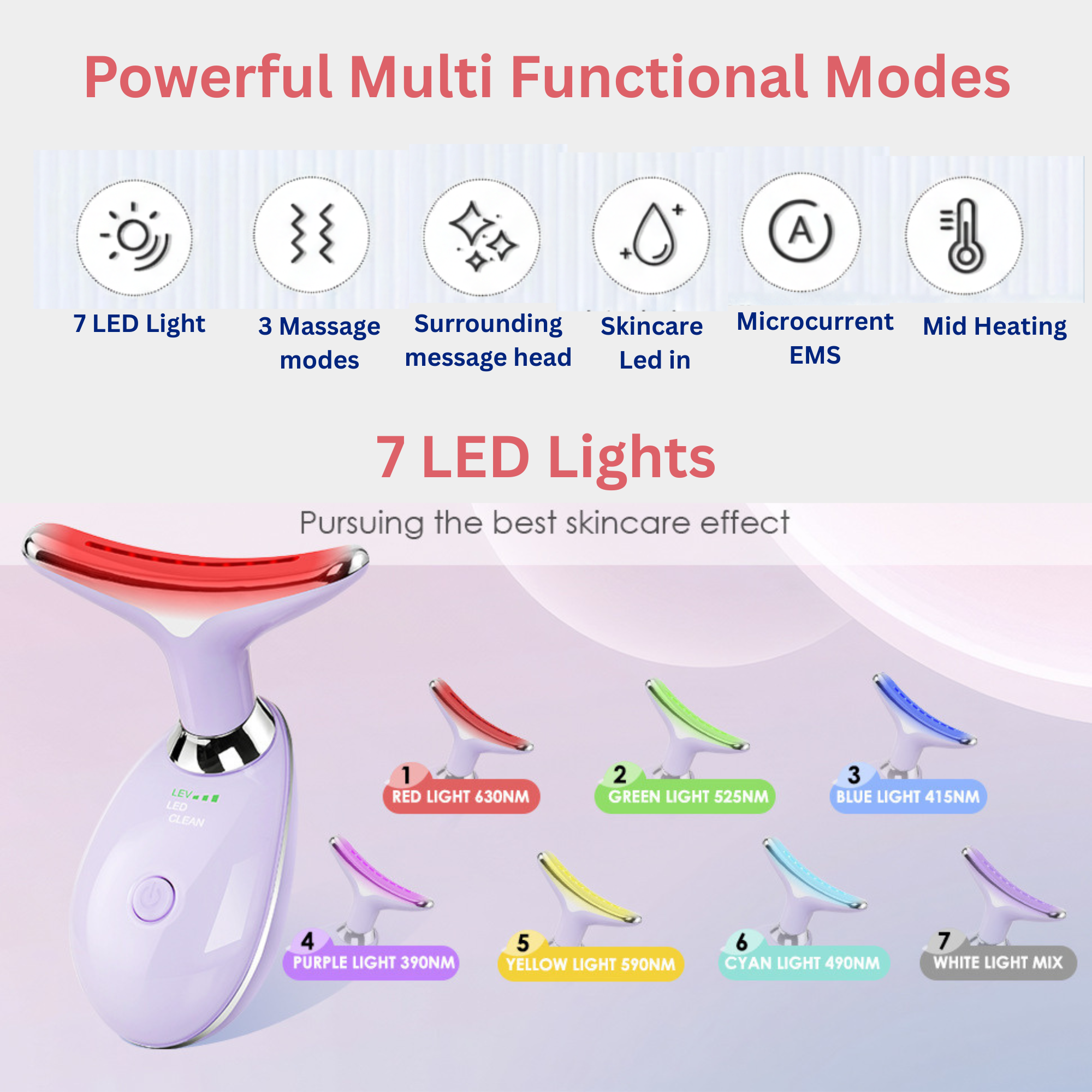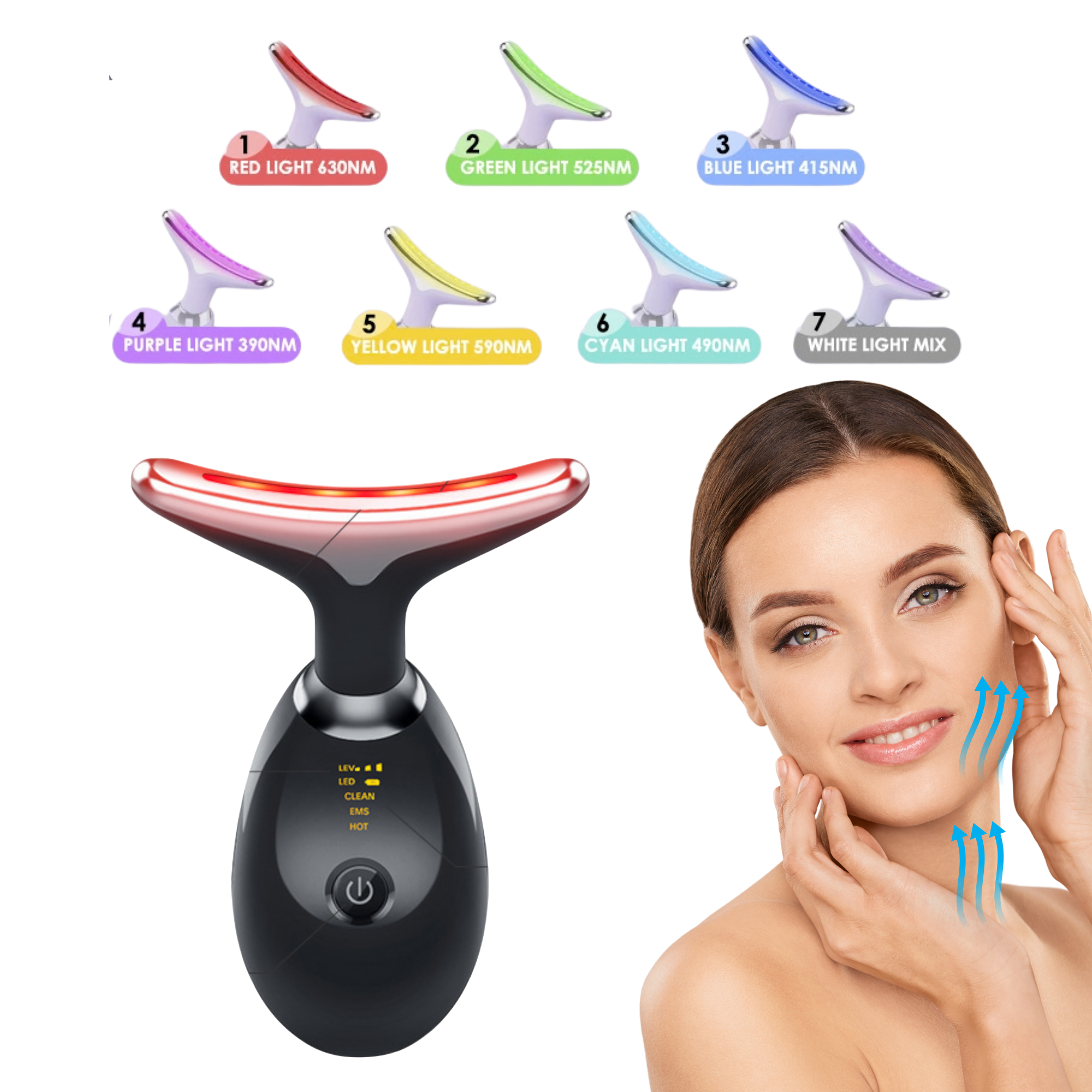 7-Colour LED Light Therapy: Precisely target diverse skin needs with seven distinct wavelengths, including anti-ageing Red (630nm), soothing Blue (415nm), and detoxifying Violet (390nm). Red light (630nm) fights aging and firms skin; blue light (415nm) soothes inflammation; green light (525nm) smooths fine lines; violet light (390nm) aids detoxification; yellow light (590nm) improves pigmentation; light blue light (490nm) relieves skin tension; white light (mix) provides deep relaxation—comprehensively enhancing skincare efficacy.