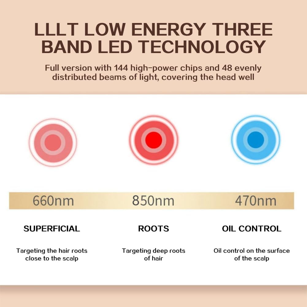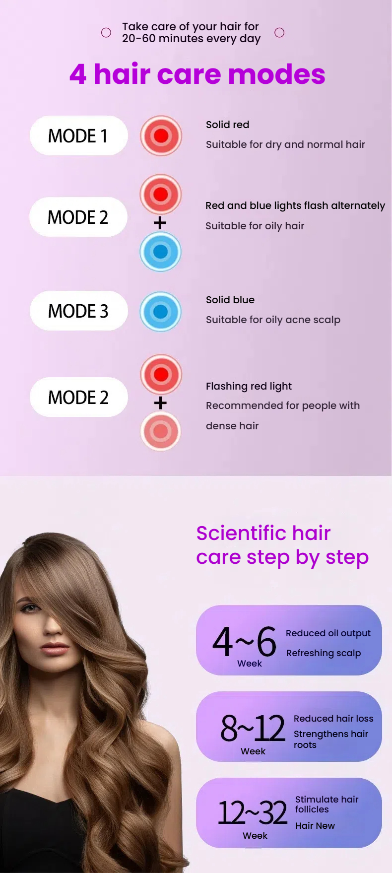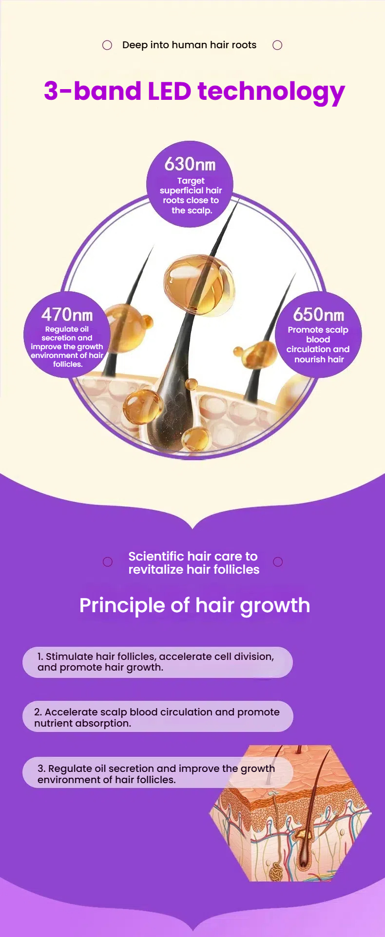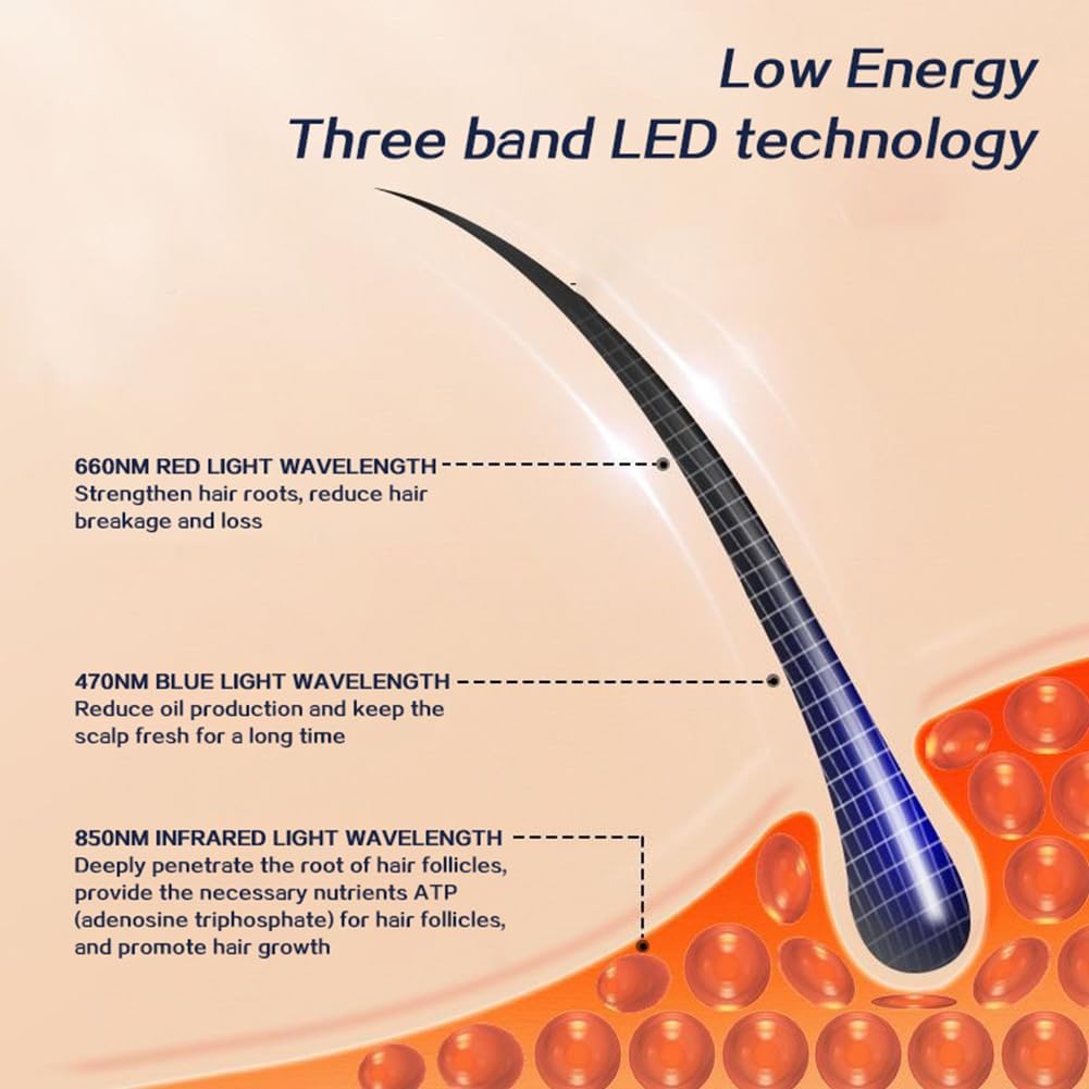 - Red Light Therapy (630nm & 650nm) penetrates deep into the scalp to stimulate circulation, reduce shedding, and wake up dormant follicles.