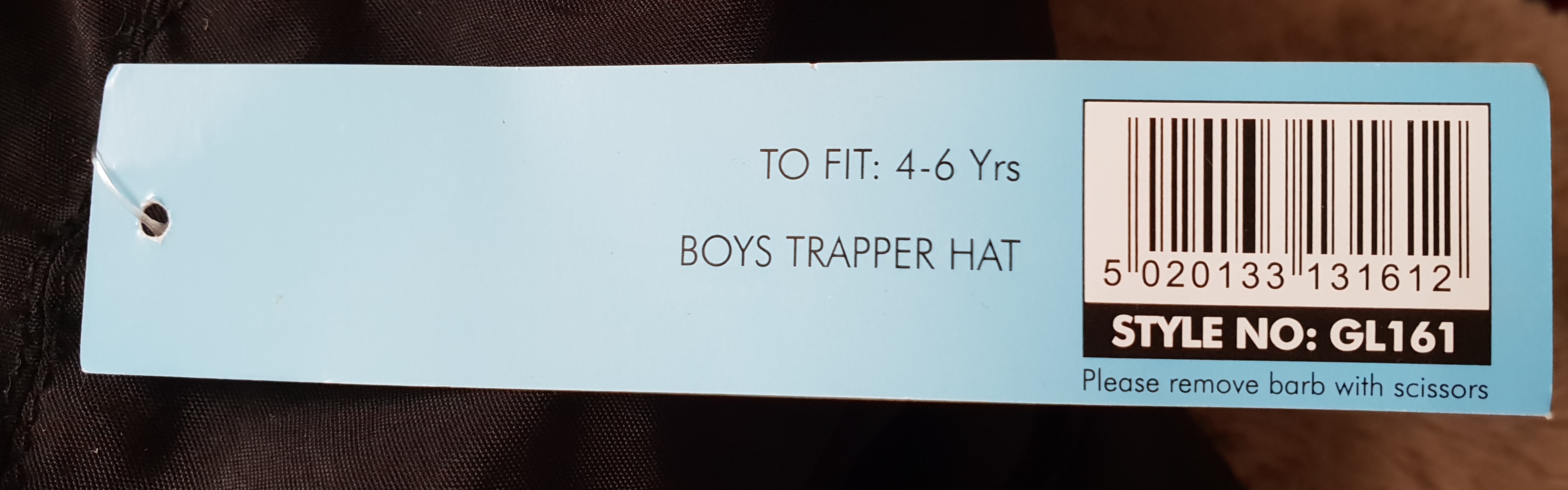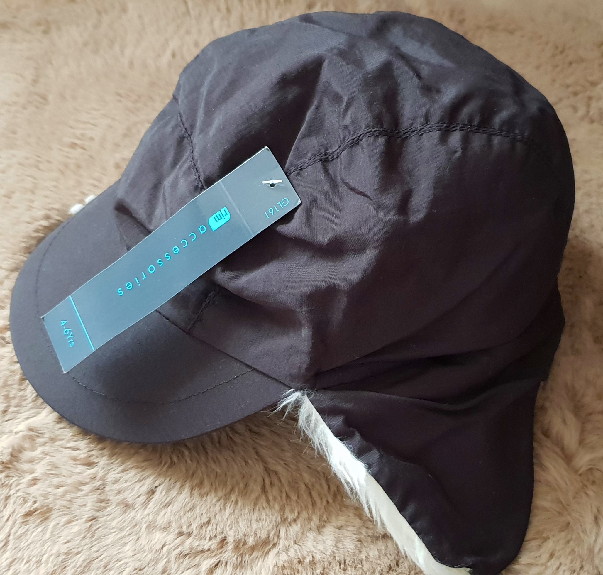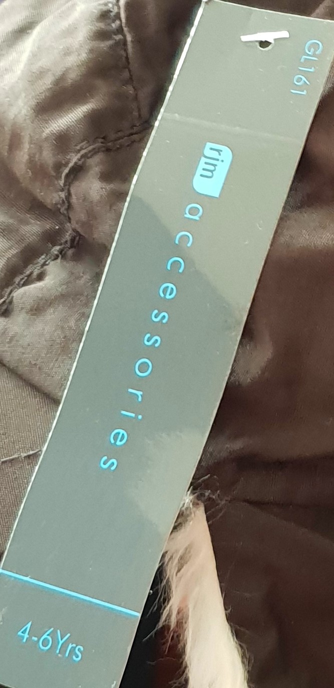 no card tags, fabric is acrylic with quilted polyester lining. Fits approximately age 8 upwards.