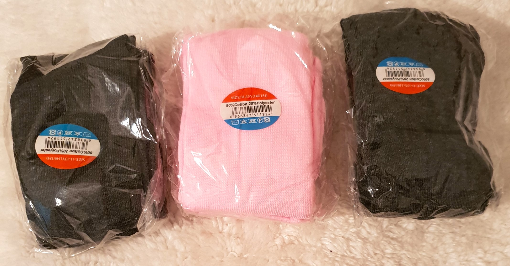 42 pairs of ribbed tights 80% cotton 20% polyester. Individually packed and tagged with label