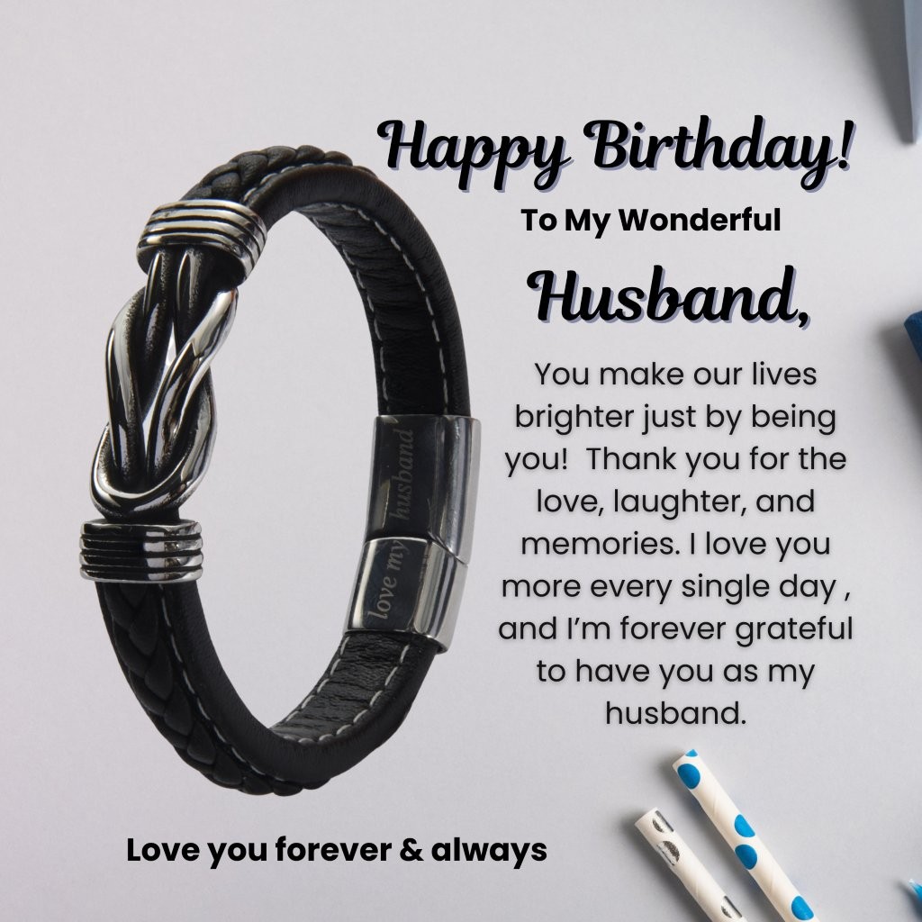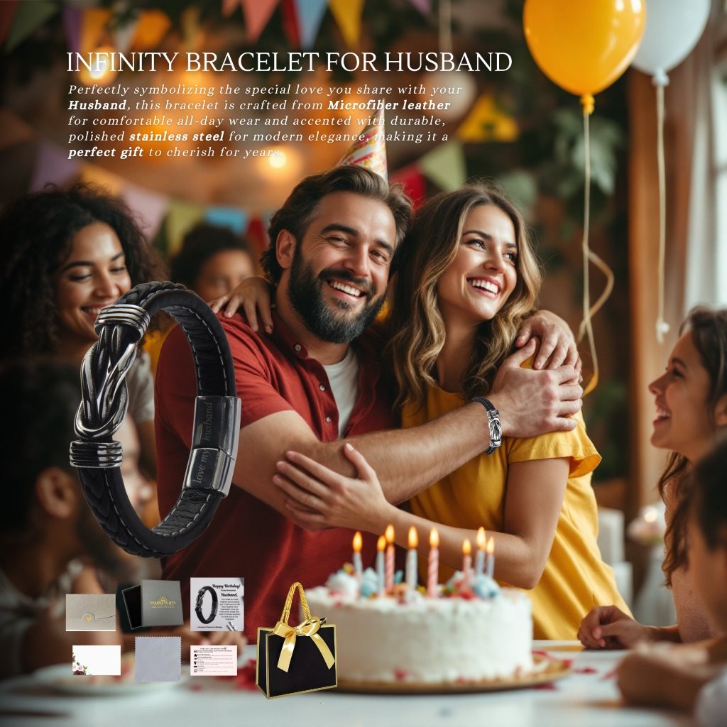 The Perfect Expression of Forever. Surprise your husband with this meaningful bracelet. This bracelet is made from Microfiber leather and features a stainless steel infinity emblem, making it a stylish and durable accessory that he can wear with pride.