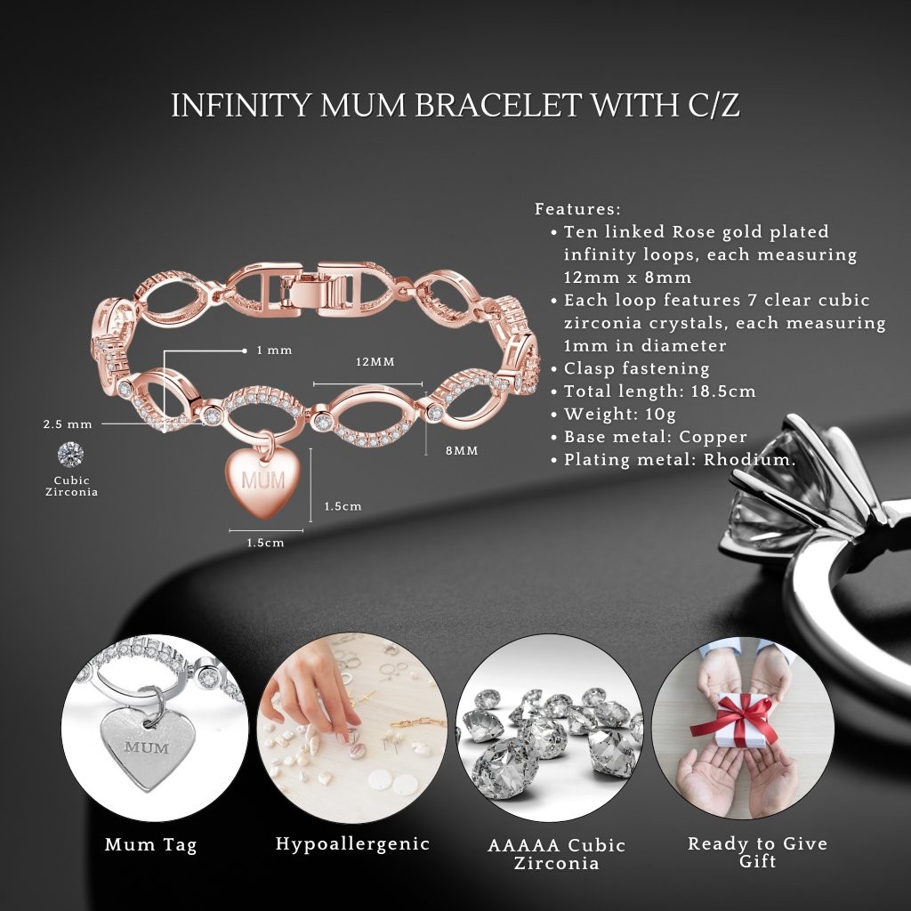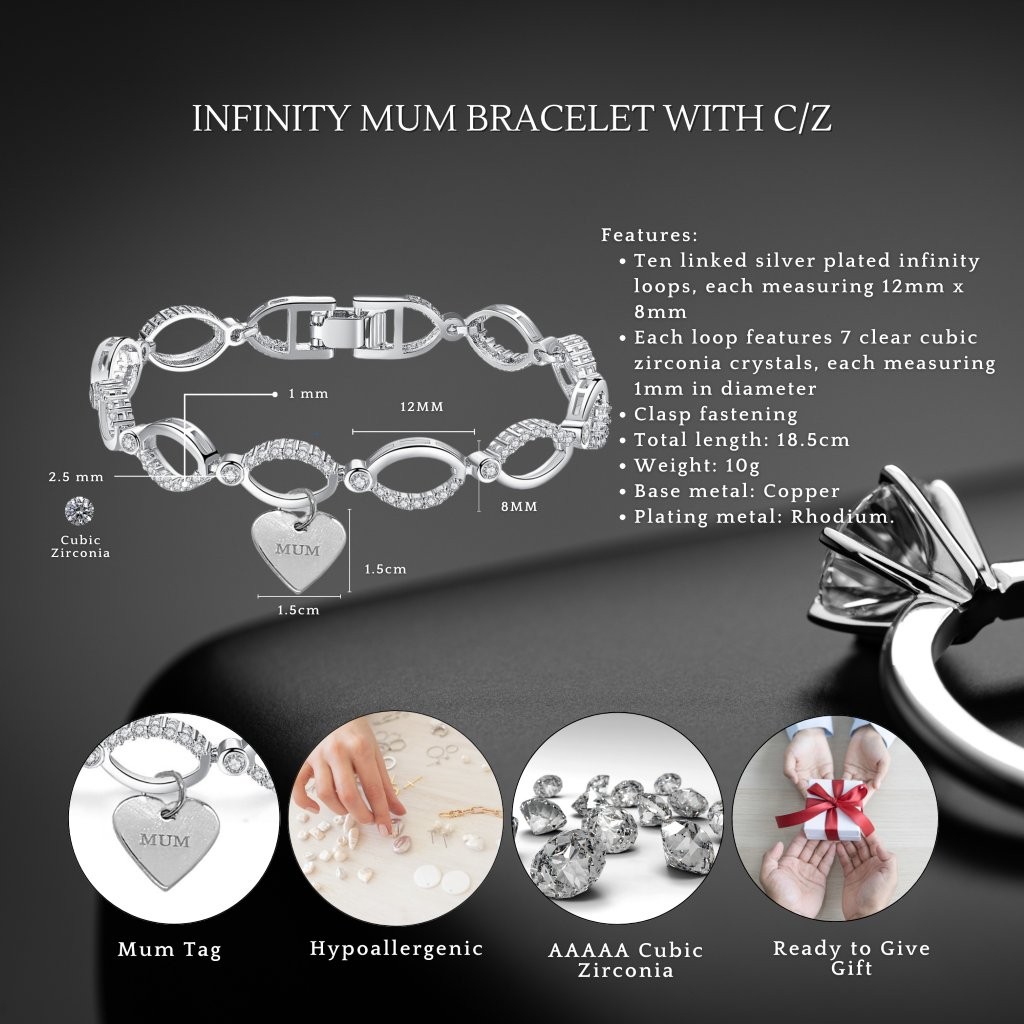 Show your love with this elegant bracelet, a perfect gift for Mum. Featuring delicate linked infinity loops adorned with sparkling clear crystals and a sweet heart charm inscribed with ‘MUM’. Available in classic silver, warm rose gold, and radiant gold finishes. Show your love and appreciation for your mum with this stylish and meaningful piece.