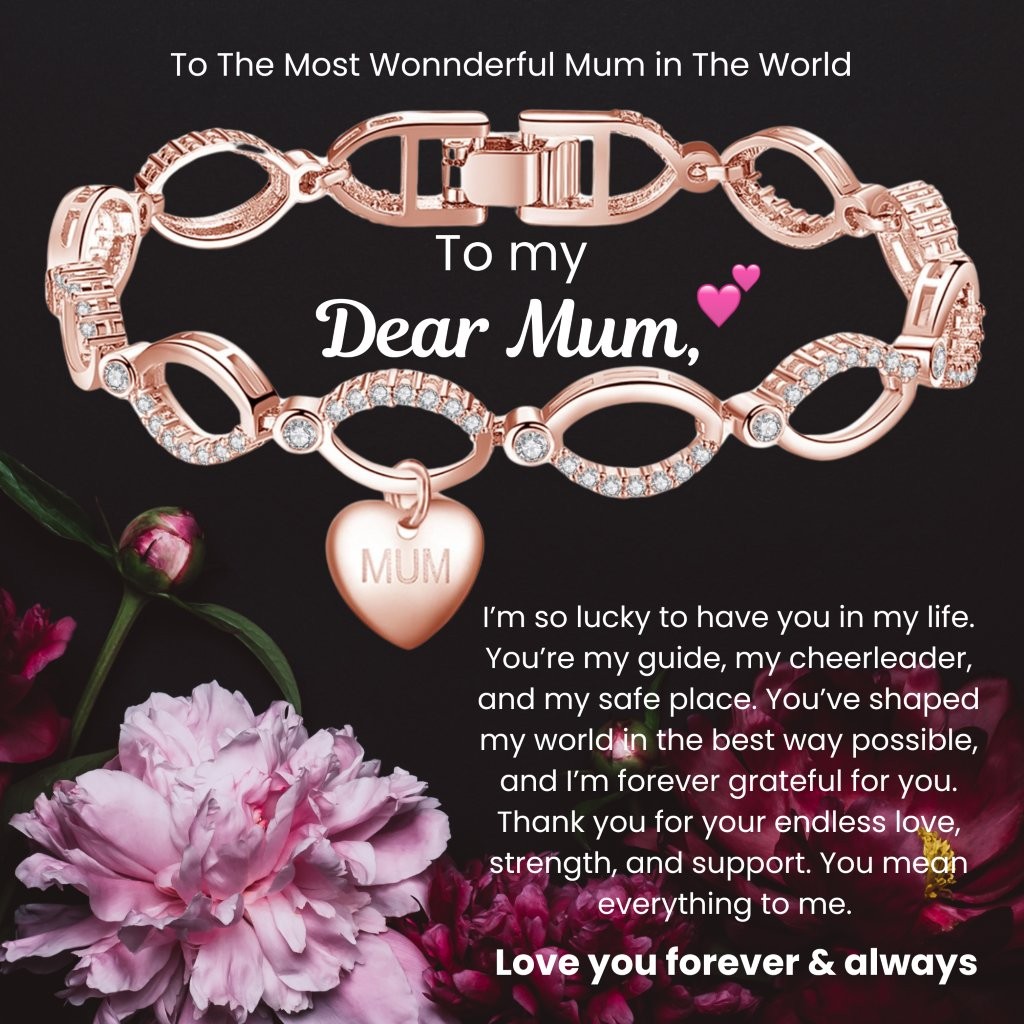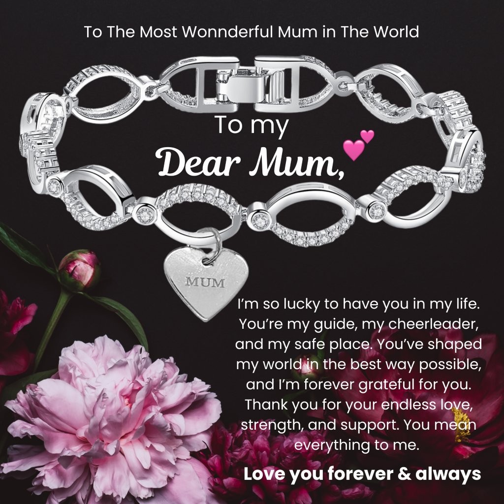 Show your love with this elegant bracelet, a perfect gift for Mum. Featuring delicate linked infinity loops adorned with sparkling clear crystals and a sweet heart charm inscribed with ‘MUM’. Available in classic silver, warm rose gold, and radiant gold finishes. Show your love and appreciation for your mum with this stylish and meaningful piece.
