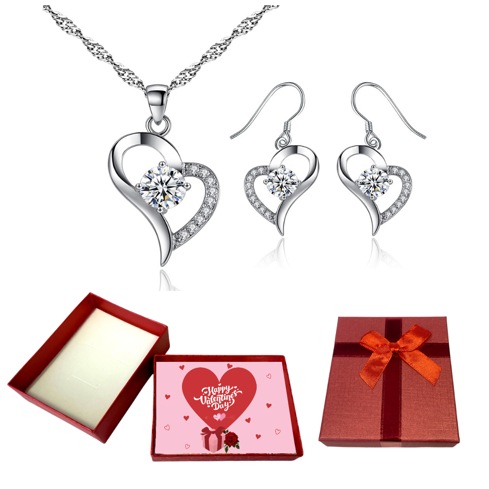 20 pcs - Heart Shaped Pendant Necklace & Earrings with Premium Crystals With Valentine Gift Box - 10 Sets|GSV009-Valentine Box|UK SELLER