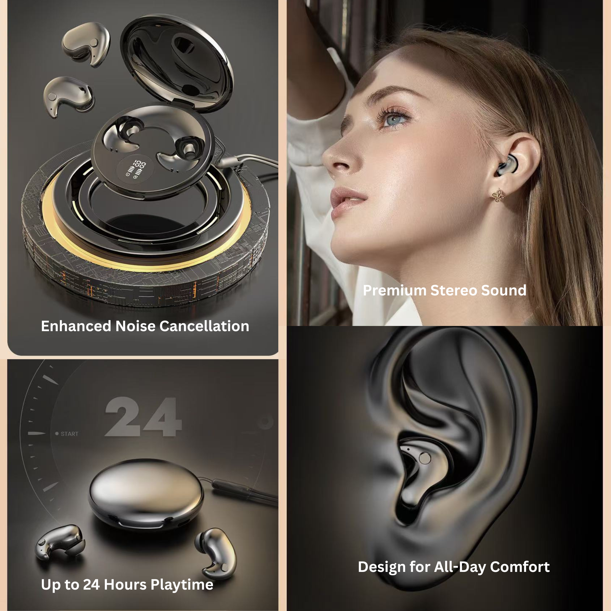 Built-in high-capacity batteries provide 24 hours of continuous playback per charge, with up to 480 hours using the portable charging case. The LED display shows remaining battery levels, and the USB-C quick charge fully powers the earbuds in just 1.5 hours—perfect for work, travel, sports, or daily use.