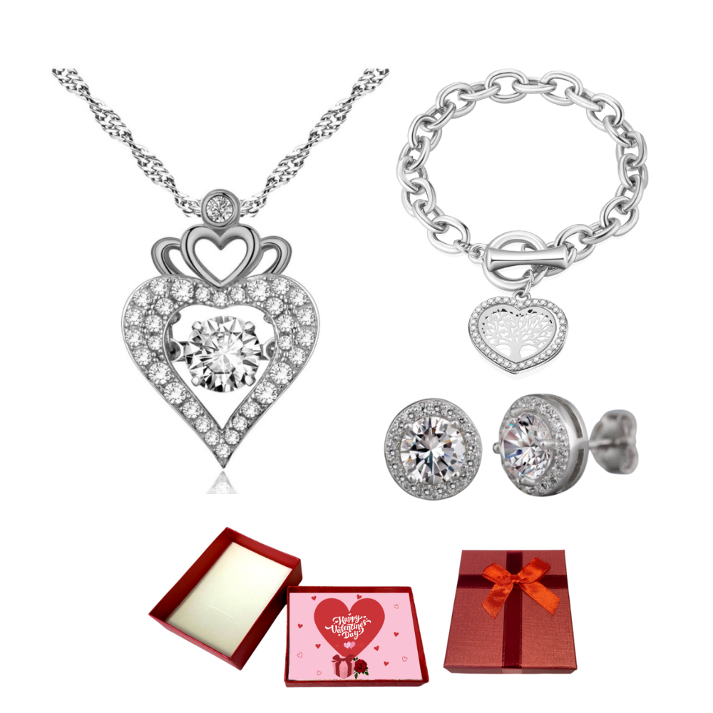 30 pcs - Silver Tree of life Heart Bracelet, Stud Round Earrings And Heart Necklace Tri-Set With Valentine’s Message Box - 10 Sets|GCJ510GCC032GCC07