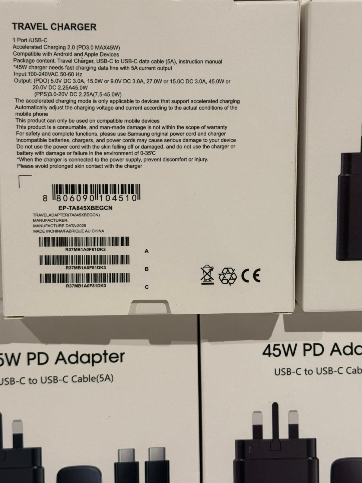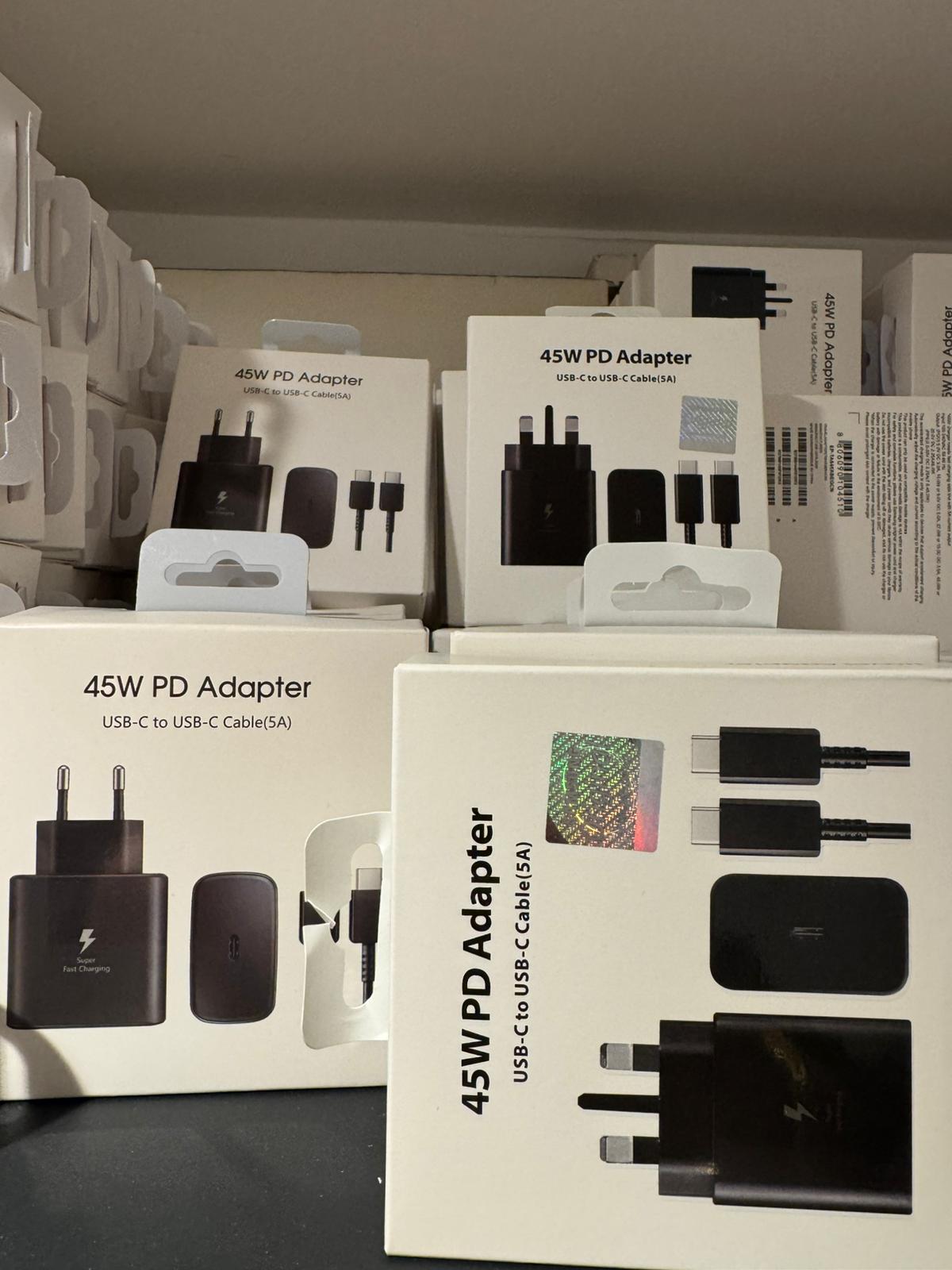 Clearance joblot of 30 new 45W USB-C charger plugs with matching 1m USB-C to USB-C cables. Ideal for resellers, market stalls, repair shops or bulk buyers looking for fast chargers compatible with All Samsung Type-C Compatible phones and other USB-C devices.
