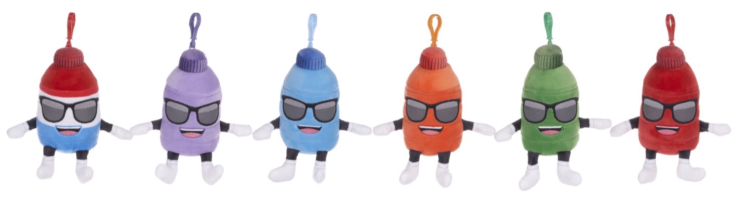 5” / 13cm plush bag clips; set of 6 assorted energy drink designs; clip-on keychain attachment; bright, fun novelty styling; soft, high-quality plush construction; supplied in cases of 120.