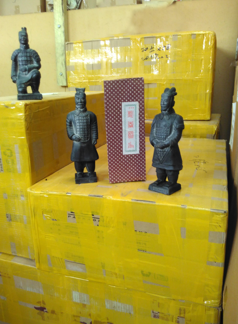 These figures are all made from dark-coloured terracotta clay in Xian China, just like the original warriors. Each figure is individually wrapped and boxed, packed in cartons of various sizes.