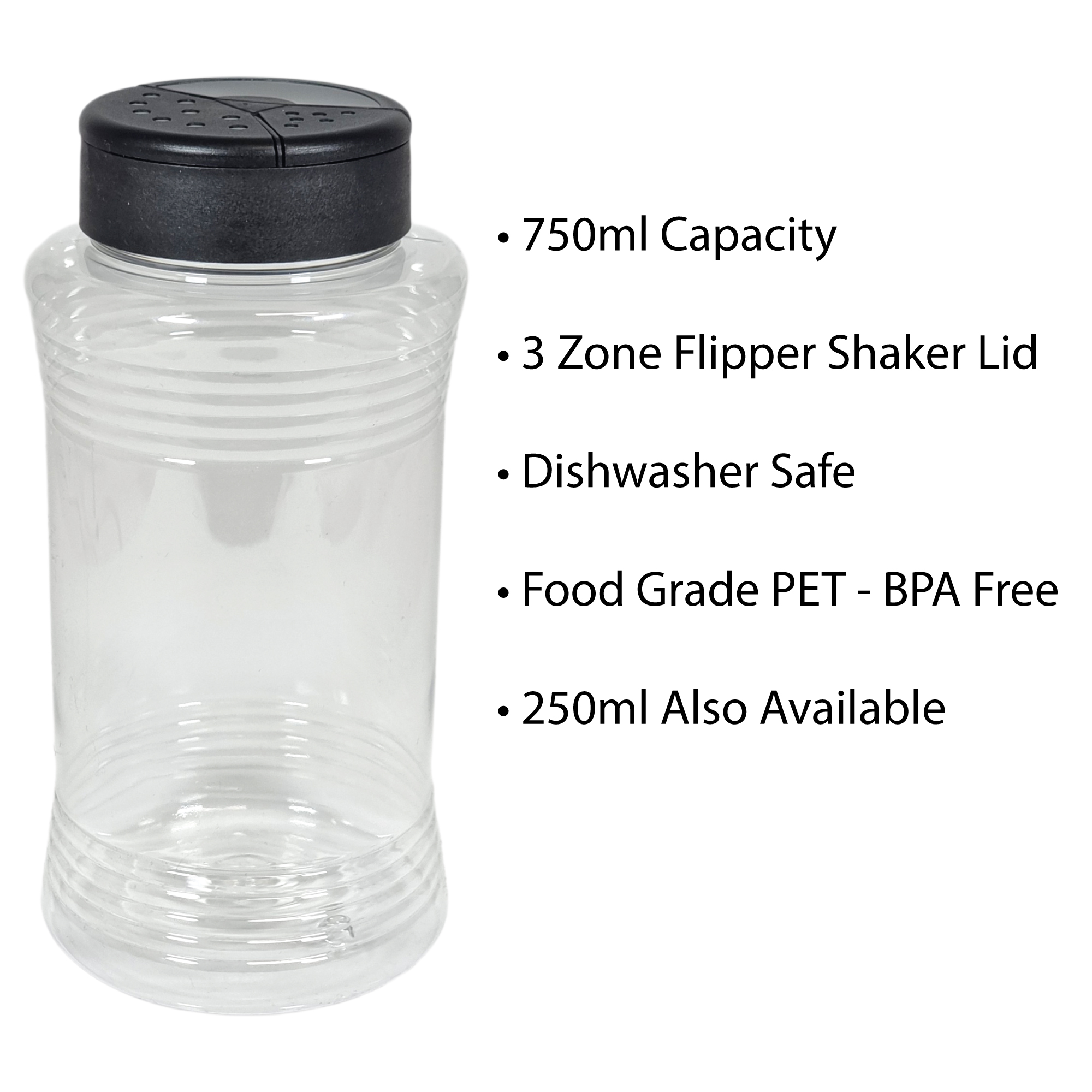 750ml Clear PET Plastic Bottles with 3 Zone Flipper Shaker Lid Dishwasher Safe