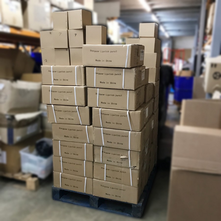 A pallet of more than 43000 lipstick pencils (around 5000 per shade).