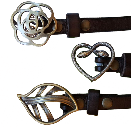 A selection of belt buckles with matching belts in Dark tan, Light tan and Black leather.