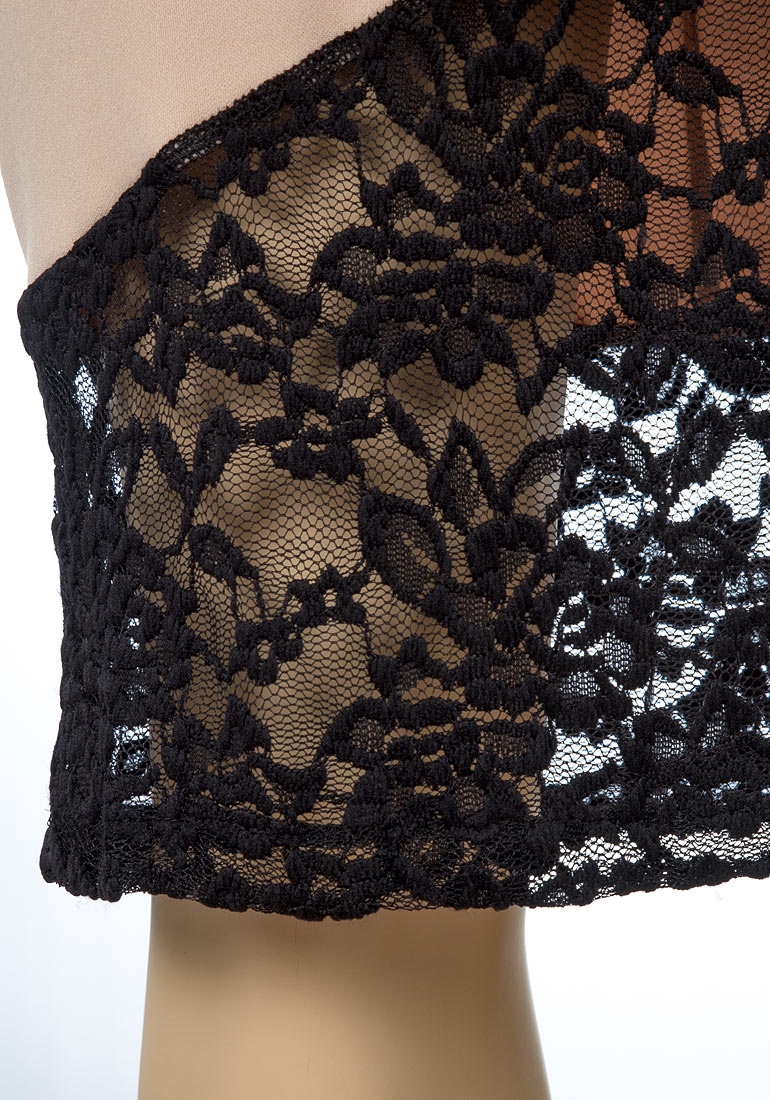Excellent quality evening wear knee length bodycon dress with oversized faux leather waistband and lace floral hem