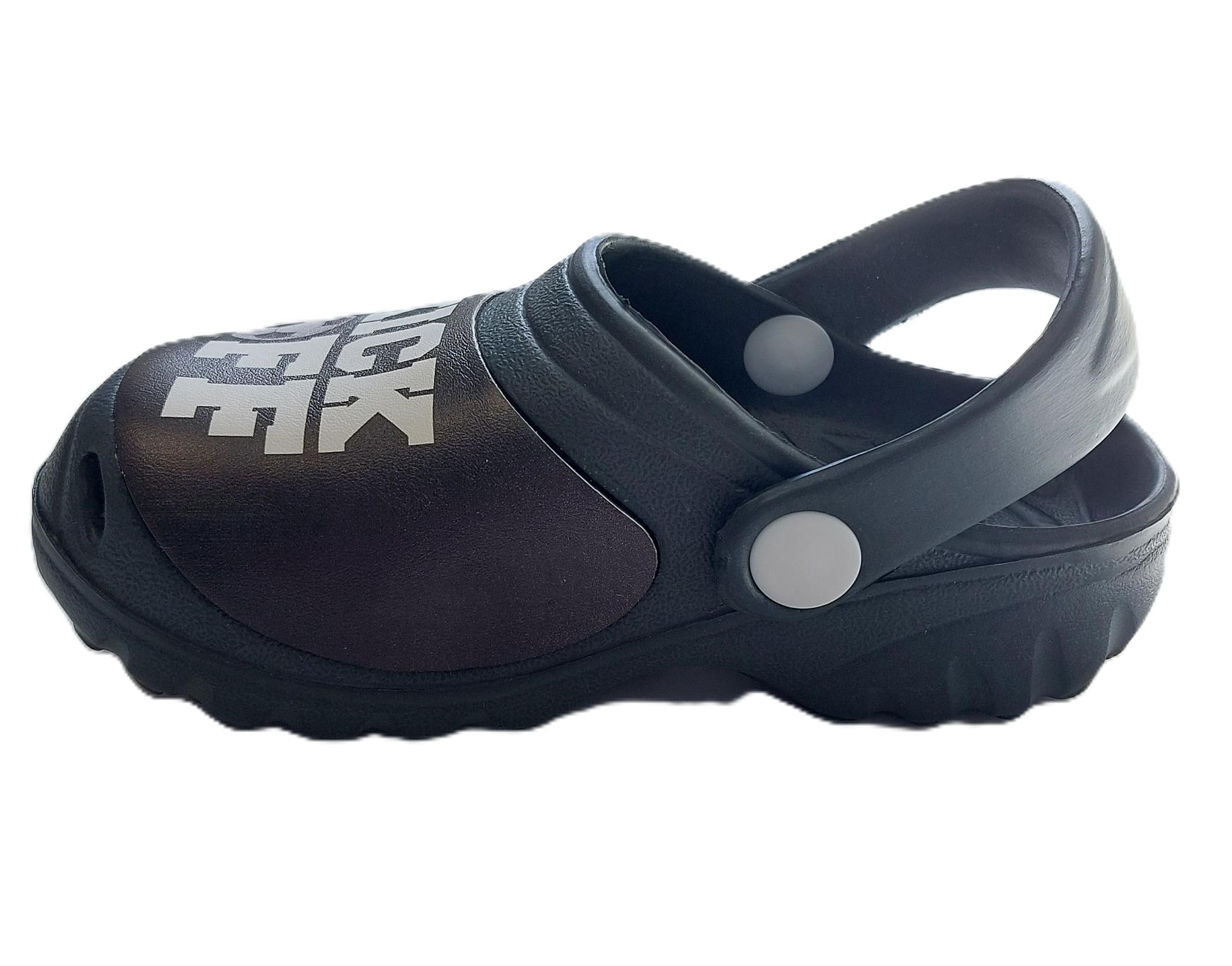 CHILDREN'S CLOGS - BLACK WITH FOOTBALL PRINT DETAIL, 5 SIZES, 50 UNITS PER JOB LOT
