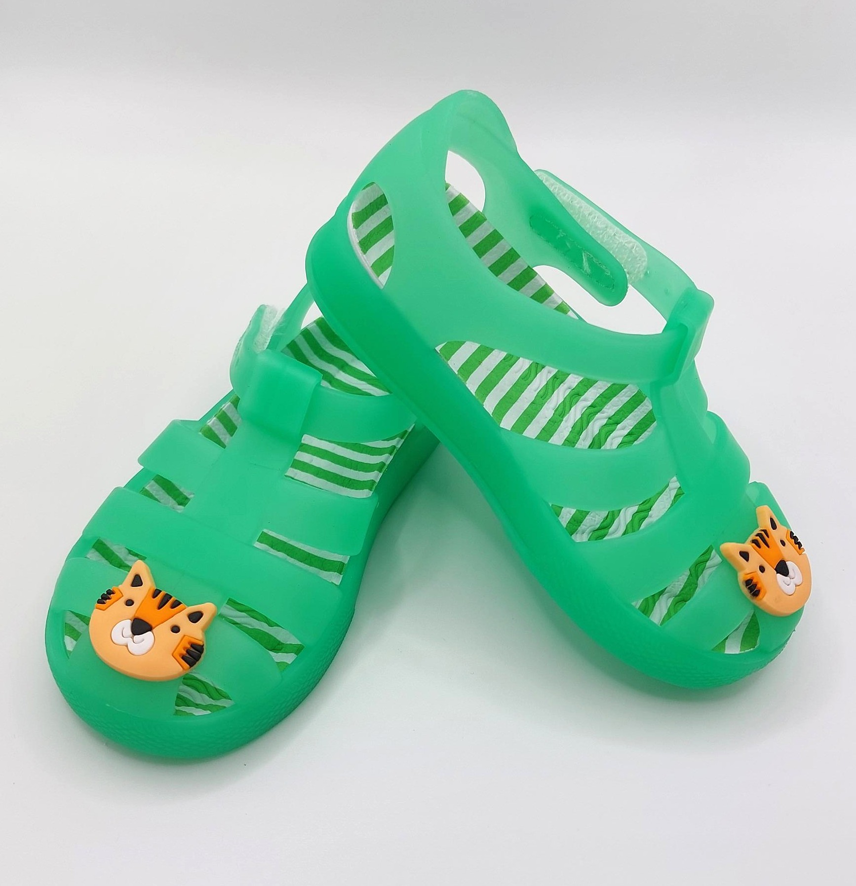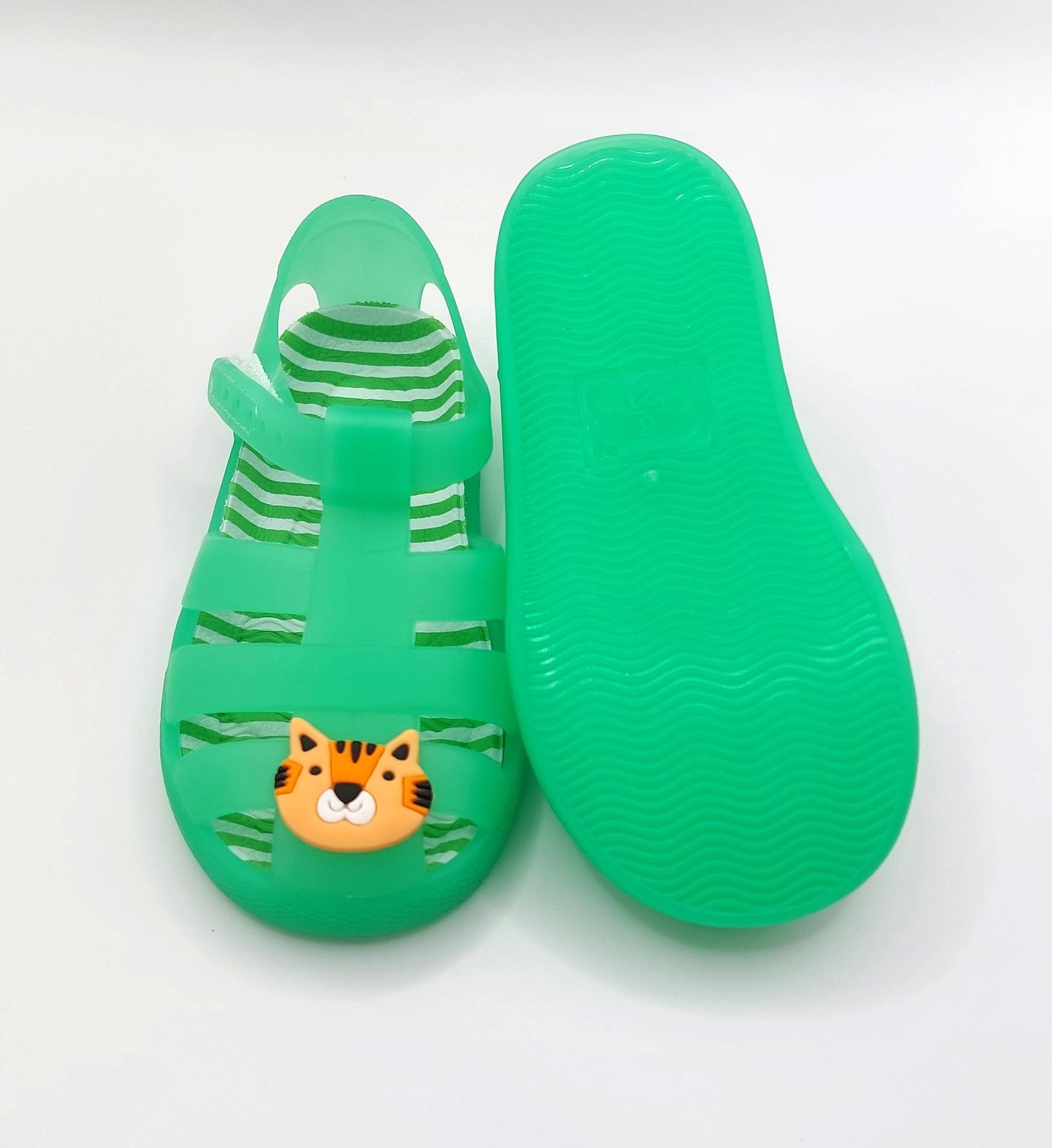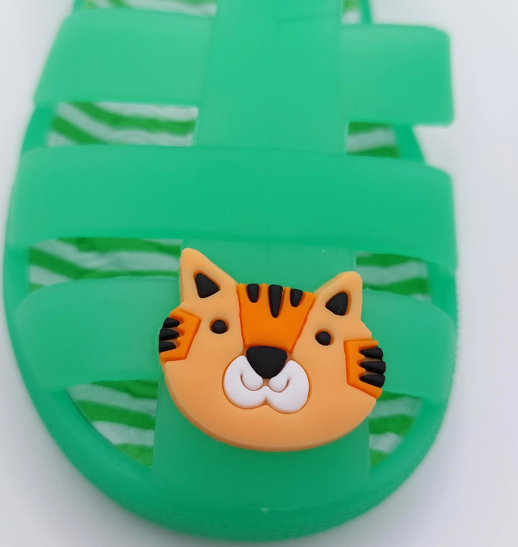 Children's green jelly shoes with tiger detail.