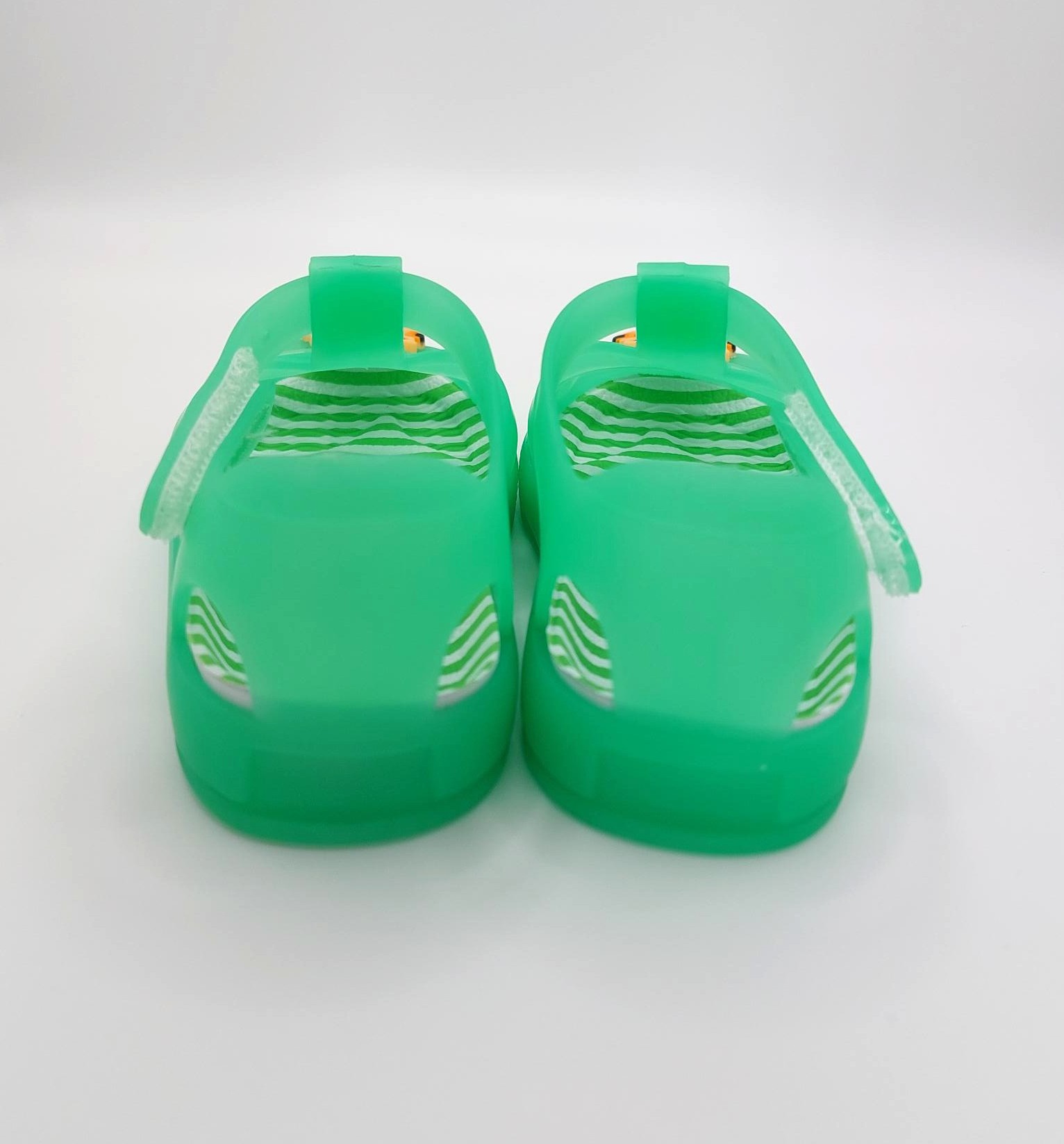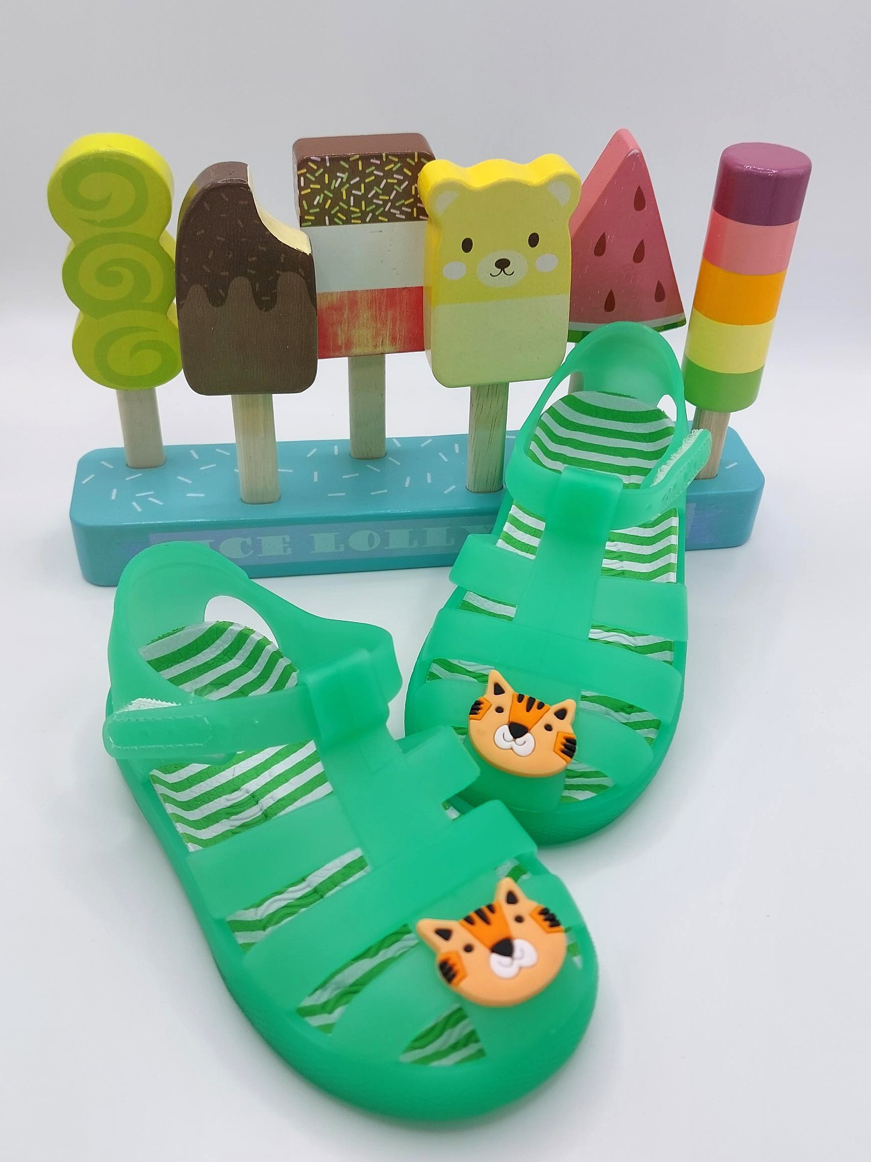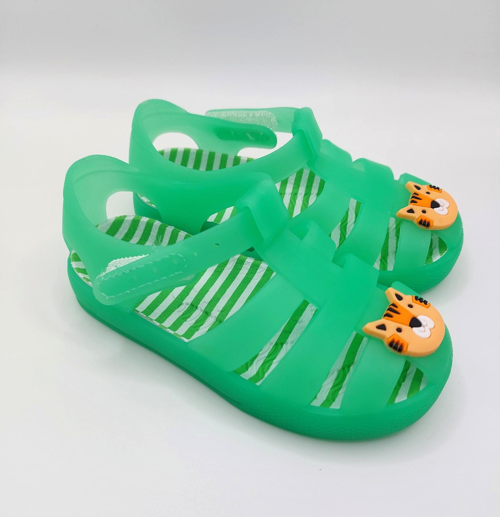 Children's green jelly shoes with tiger detail.