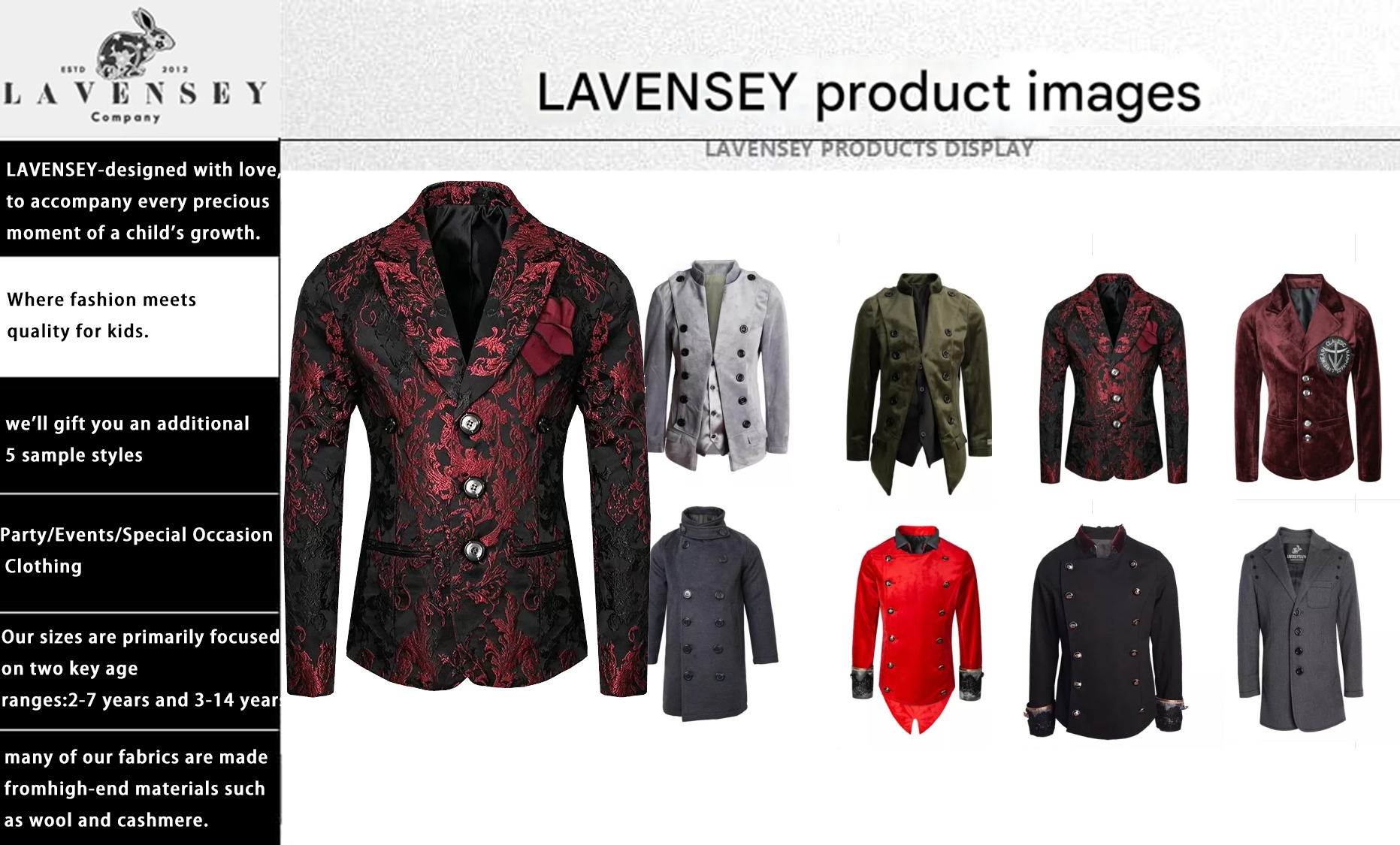 Welcome to view our product list. In the images, you will find 8 different styles of boys' clothing, which are now available at a clearance price below cost due to limited sizes. These items are sold in bulk and include high-end jacquard suits, casual suits, extended formal suits, vintage jackets, wool coats, and more. All products are from the designer brand LAVENSEY, with sizes ranging from 3 to 12 years.