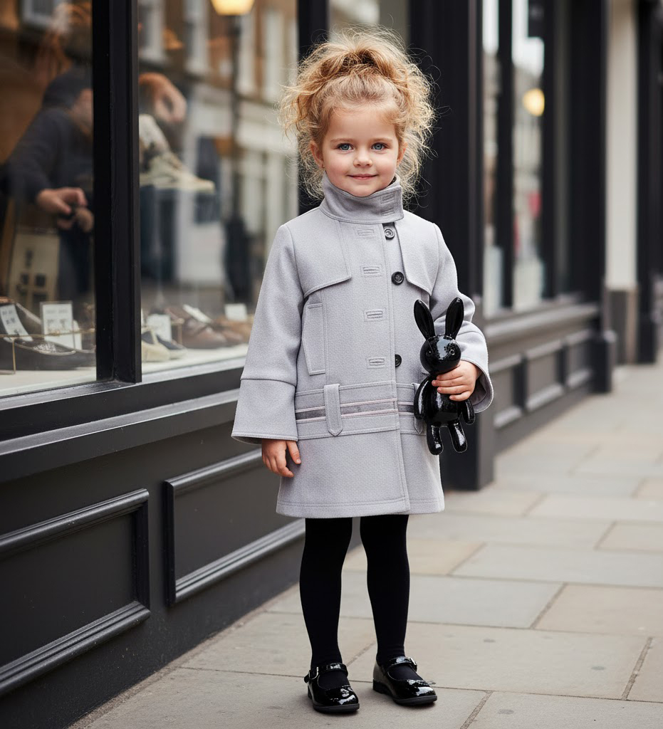 Girls High-Neck Double-Breasted Trench Jacket – Vintage Spring & Autumn Outerwear (Ages 3–10) Designed for gentle seasonal transitions, this elegant high-neck jacket blends vintage British tailoring with lightweight comfort. Perfect for spring and autumn layering, it offers a refined silhouette while allowing freedom of movement for everyday adventures. The structured high collar adds a sophisticated touch while protecting against cool breezes, making it both stylish and practical. ✨ Two Premium Fabric Options Deep Blue Cotton-Denim Blend Crafted from original cotton-blend denim fabric with slight stretch. Initially structured, it softens beautifully after washing, developing a subtle vintage texture over time. Light Gray Wool-Blend Fabric A lightweight wool-blend material that provides gentle warmth without heaviness. Soft, breathable, and ideal for transitional weather.