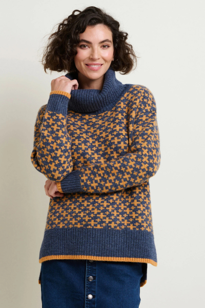 Soft meets sustainable in this chunky roll neck jumper with X stitch detailing. Made using recycled plastic bottles, this loose fitting knit features a longer length, dipped back hem, and dropped sleeves for a relaxed look.
