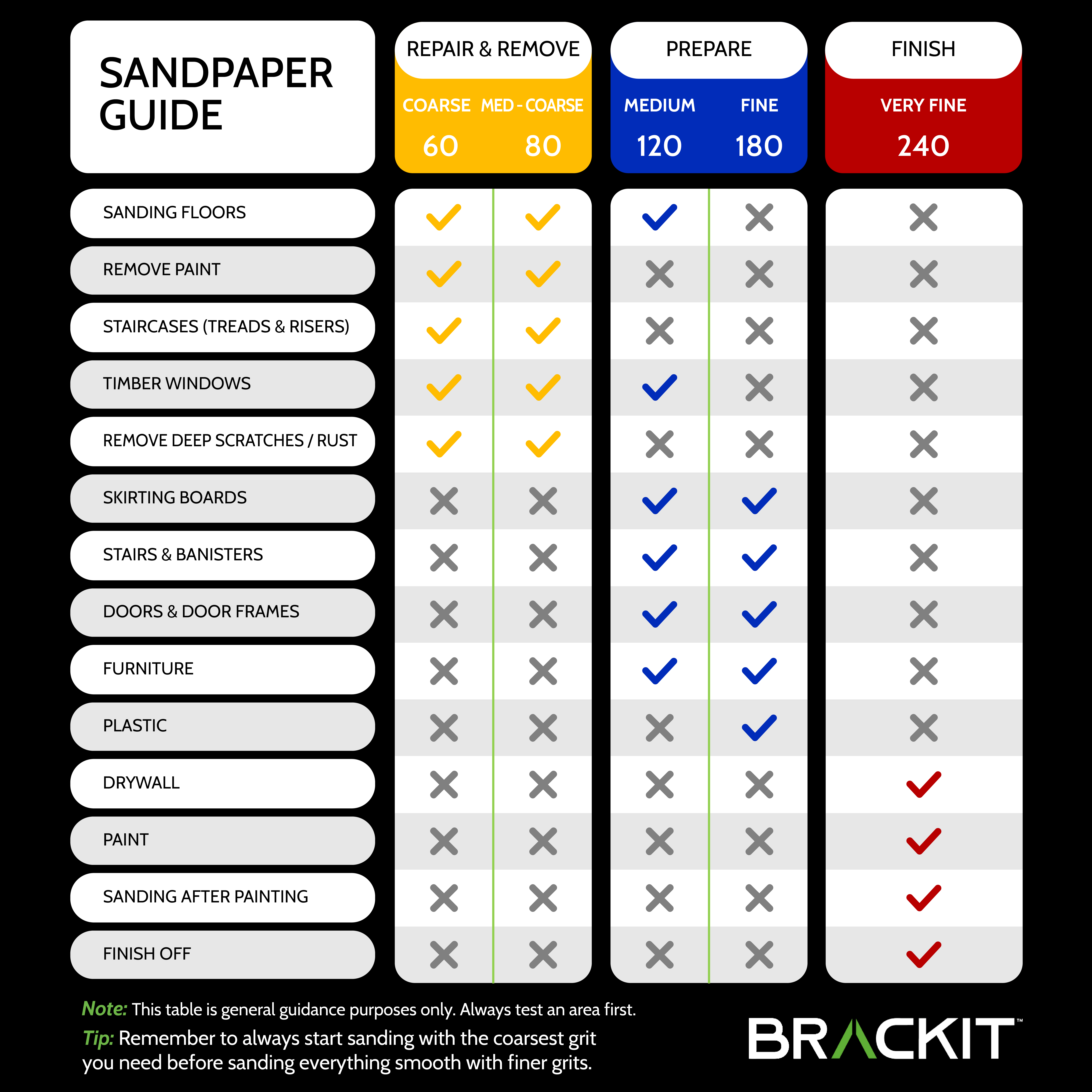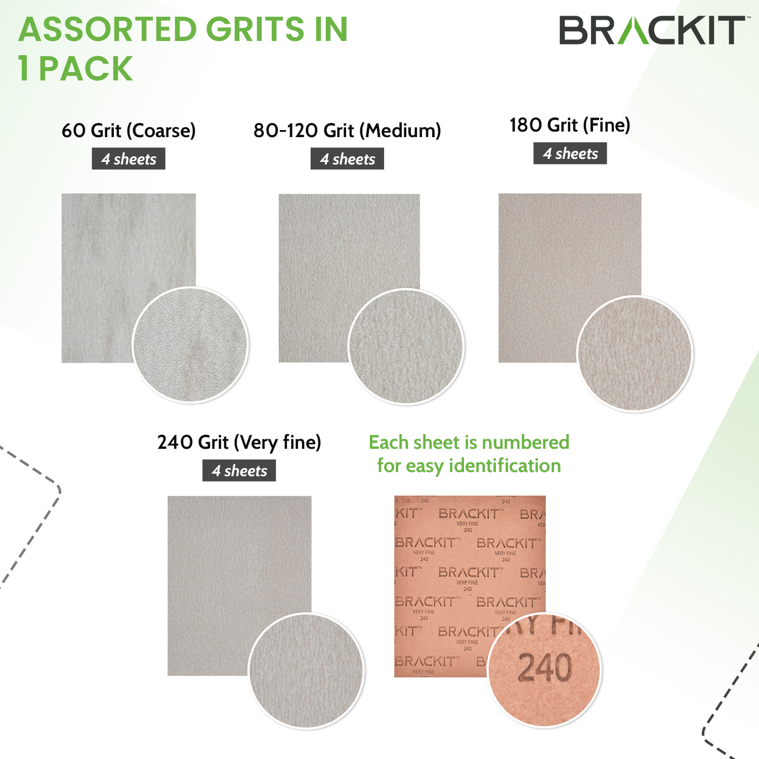 - High Quality: Our assorted sandpaper sheets come in all grit grades including 60 grit (Coarse), 80-120 grit (medium), 180 grit (fine) and 240 grit (extra fine) all clearly labelled at the back of each sheet. They can also be cut into smaller sizes or wrapped around a sanding block for ease of use.