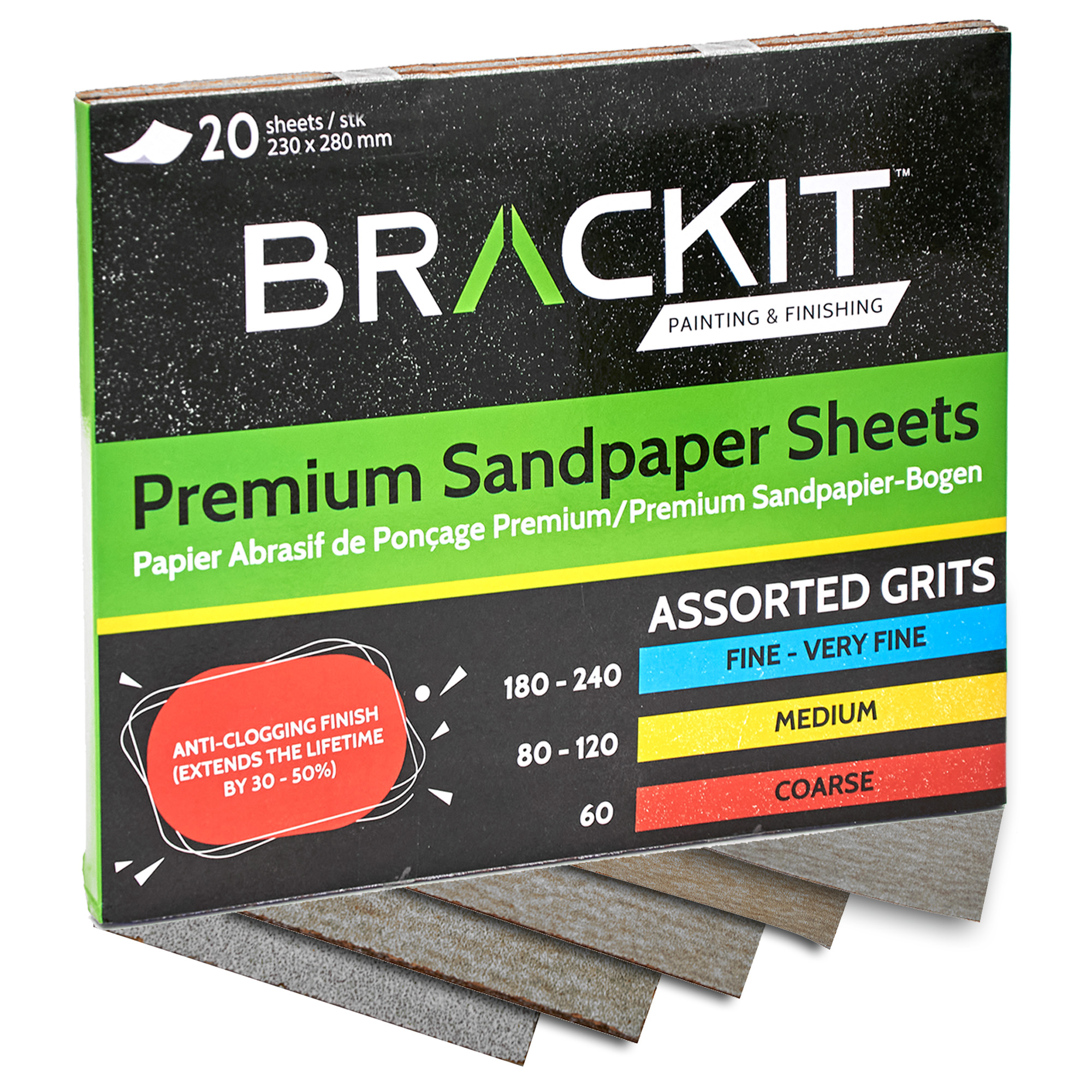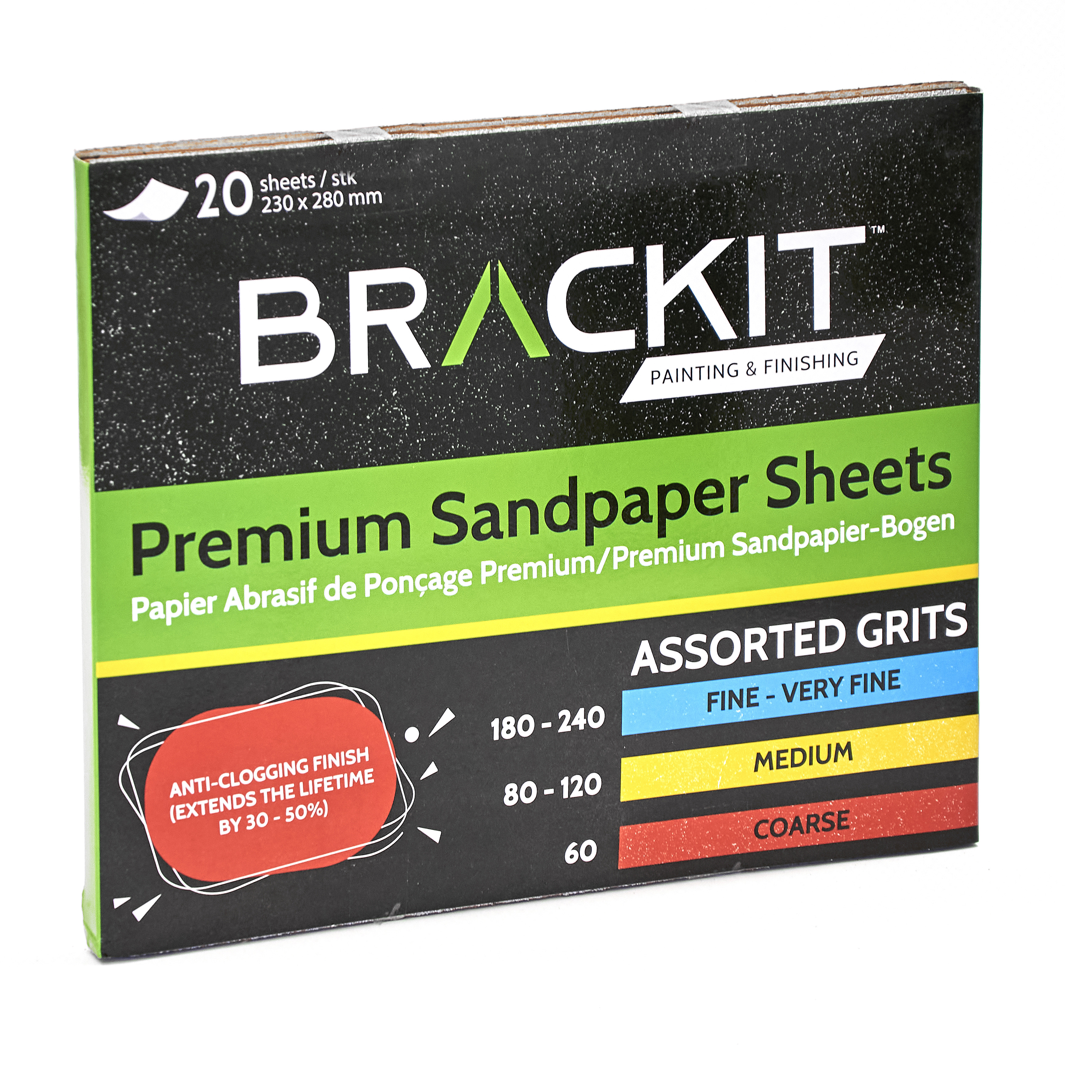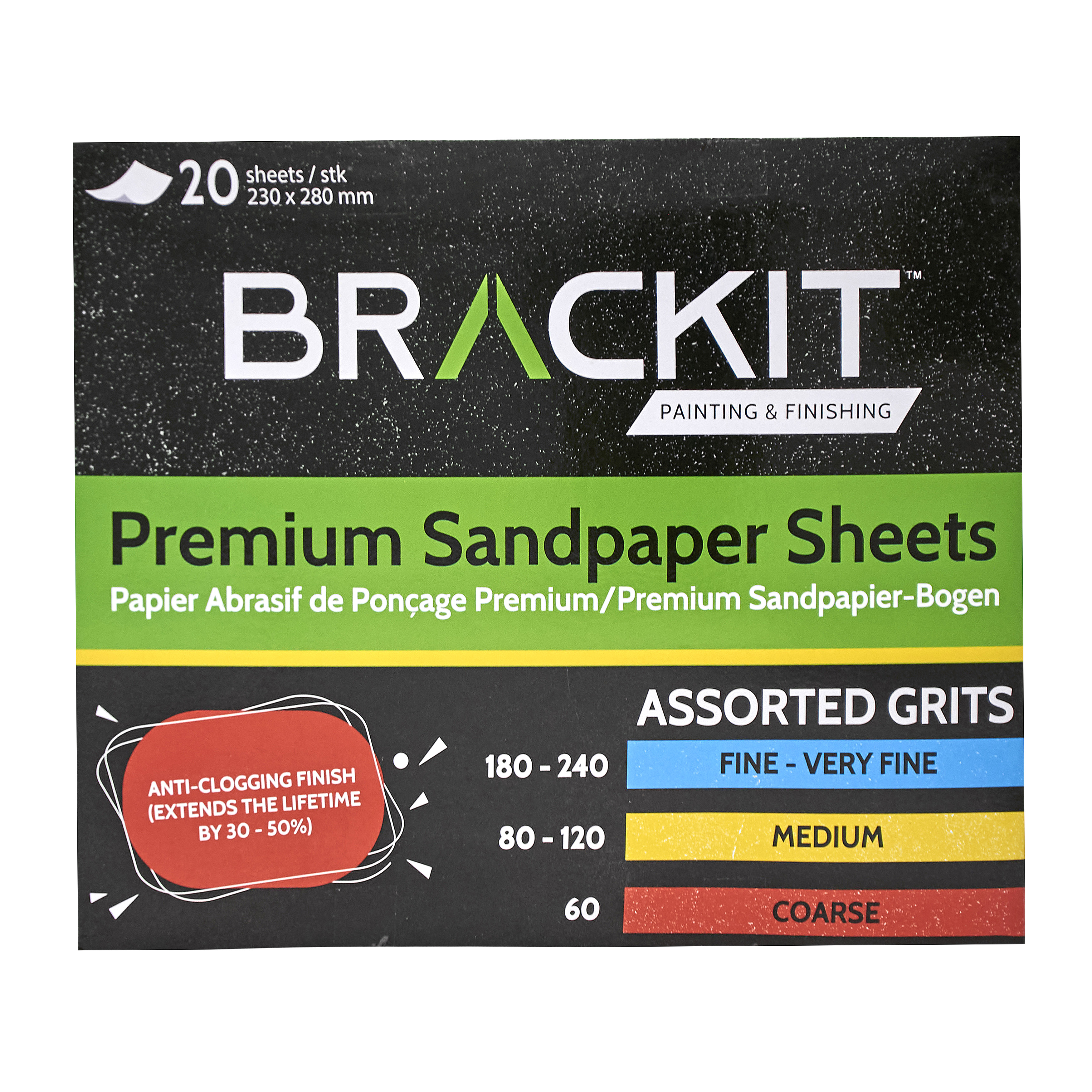 JOBLOT OF 20 packs of Brackit 20 Piece Sandpaper Sheet Set - Assorted Grits 60, 80, 120, 180, 240 - Anti-Clogging Finish and Longer Lifetime - Multipu