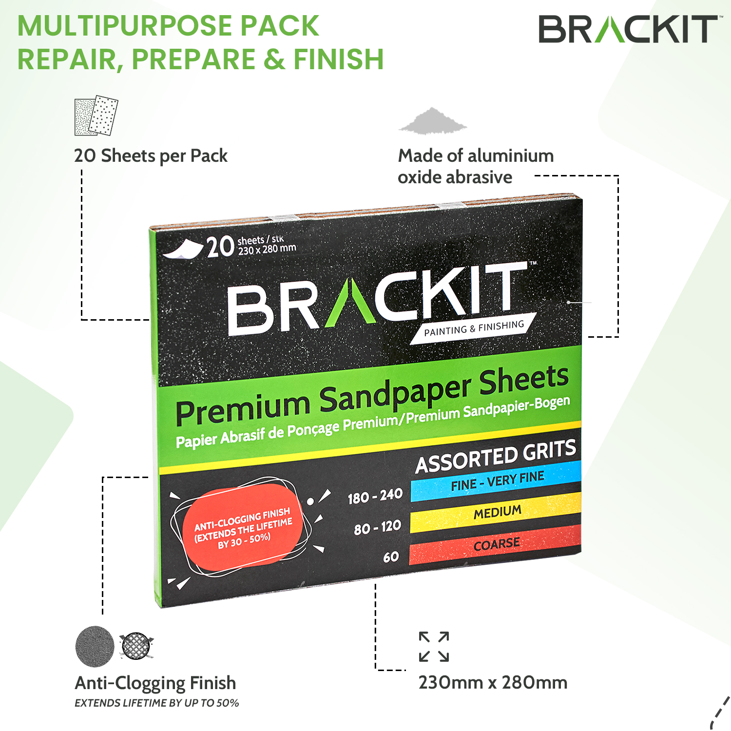 JOBLOT OF 20 packs of Brackit 20 Piece Sandpaper Sheet Set - Assorted Grits 60, 80, 120, 180, 240 - Anti-Clogging Finish and Longer Lifetime - Multipurpose Pack For Wood, Metal, Painted Walls, Plastic and More…
