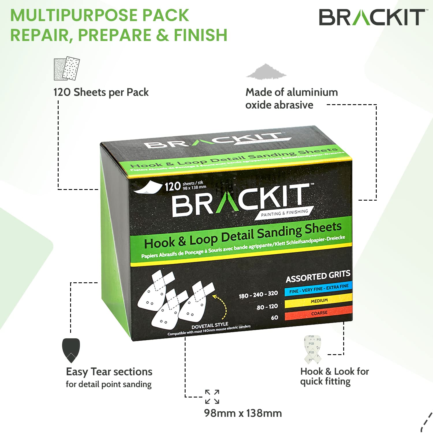 JOBLOT OF 9 PACKS OF Brackit Mouse Sandpaper Pads with Hook & Loop - 120 Bulk Pack Mixed Grits 60, 80, 120, 180, 240, 320 – Fits in Detail Palm Sanders for Buffing, Polishing or Sanding