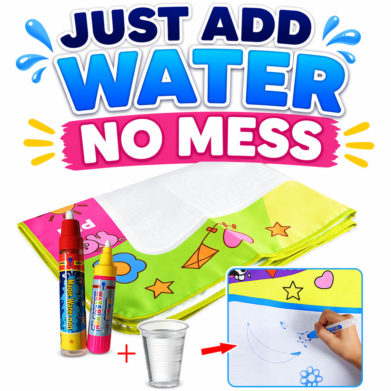 - Each unit includes 1 water drawing mat and 2 water pens