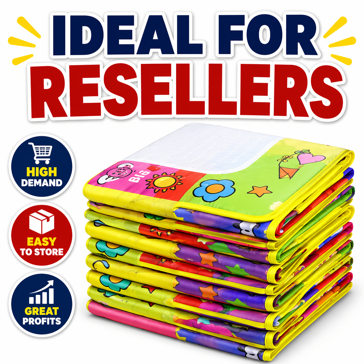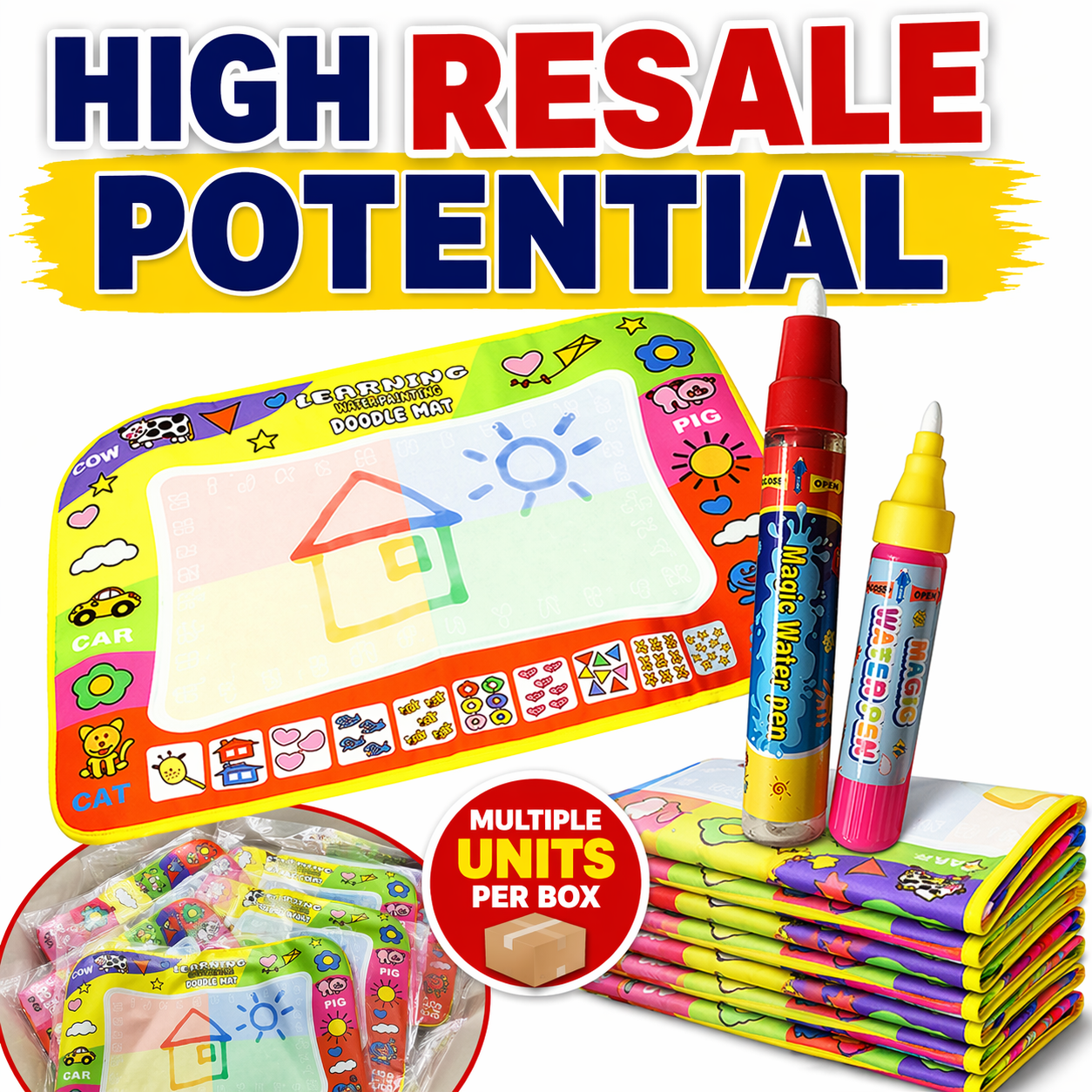 This is a wholesale joblot of reusable kids magic water drawing mats. Simply fill the pen with water and draw on the mat – no ink, no mess. Ideal clearance stock for resellers, traders, and bulk buyers looking for a popular, easy-to-sell product.