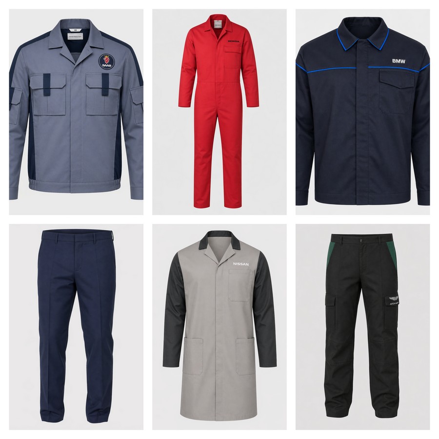 Men's mixed high quality, functional and protective work wear clothing from Cosalt Ballyclare featuring different car brand logos, such as BMW, Aston Martin, Nissan and others.