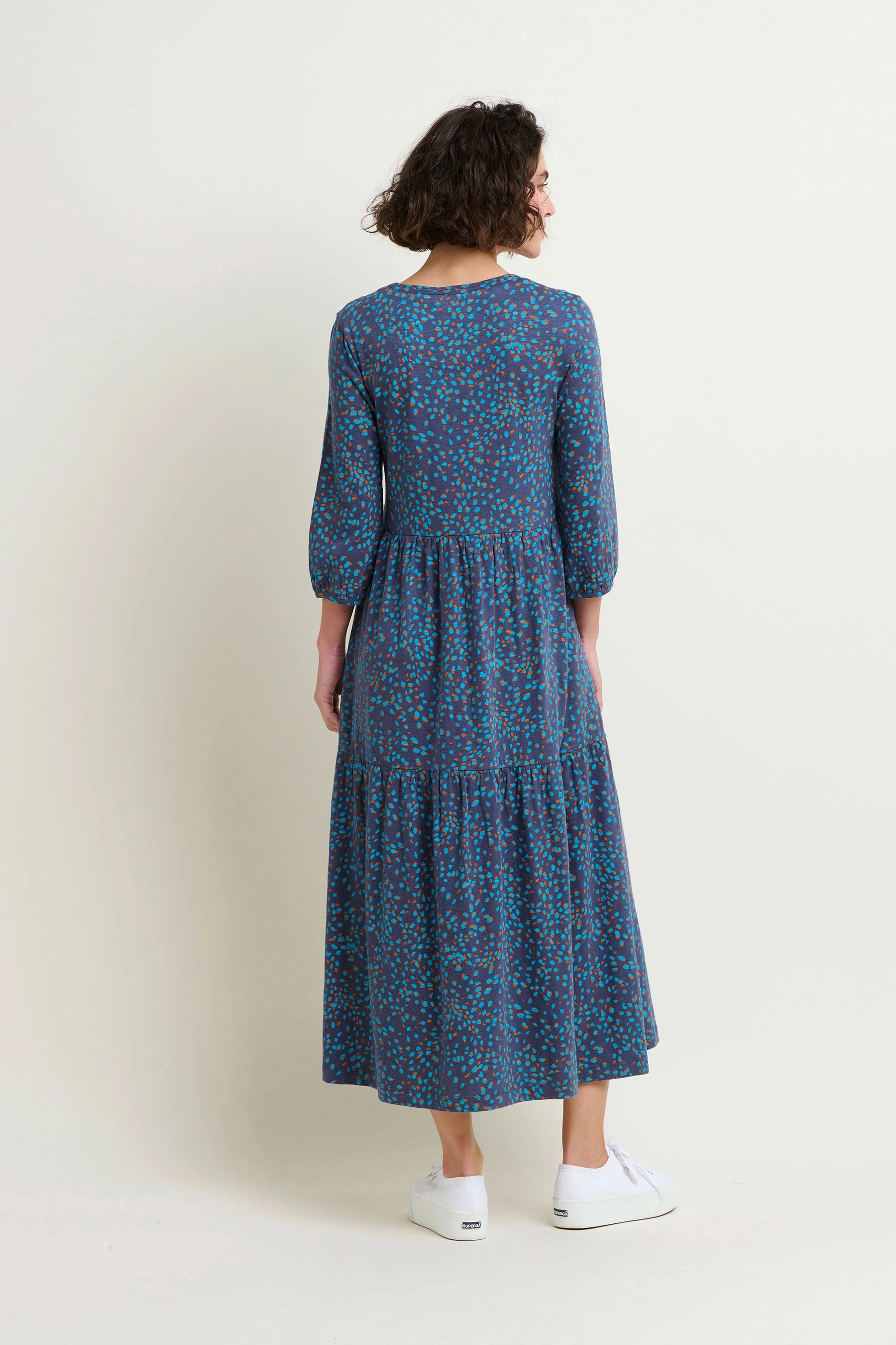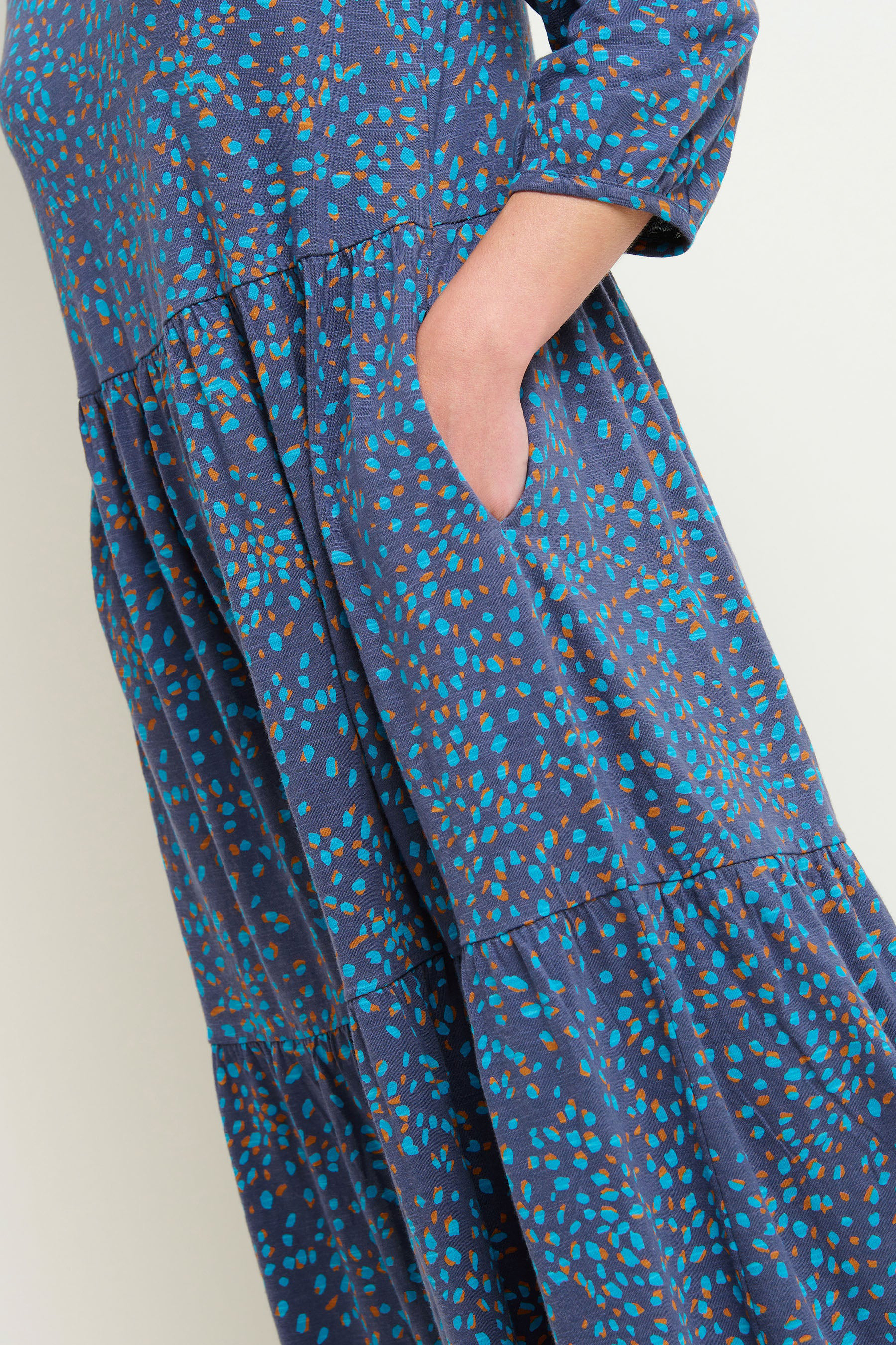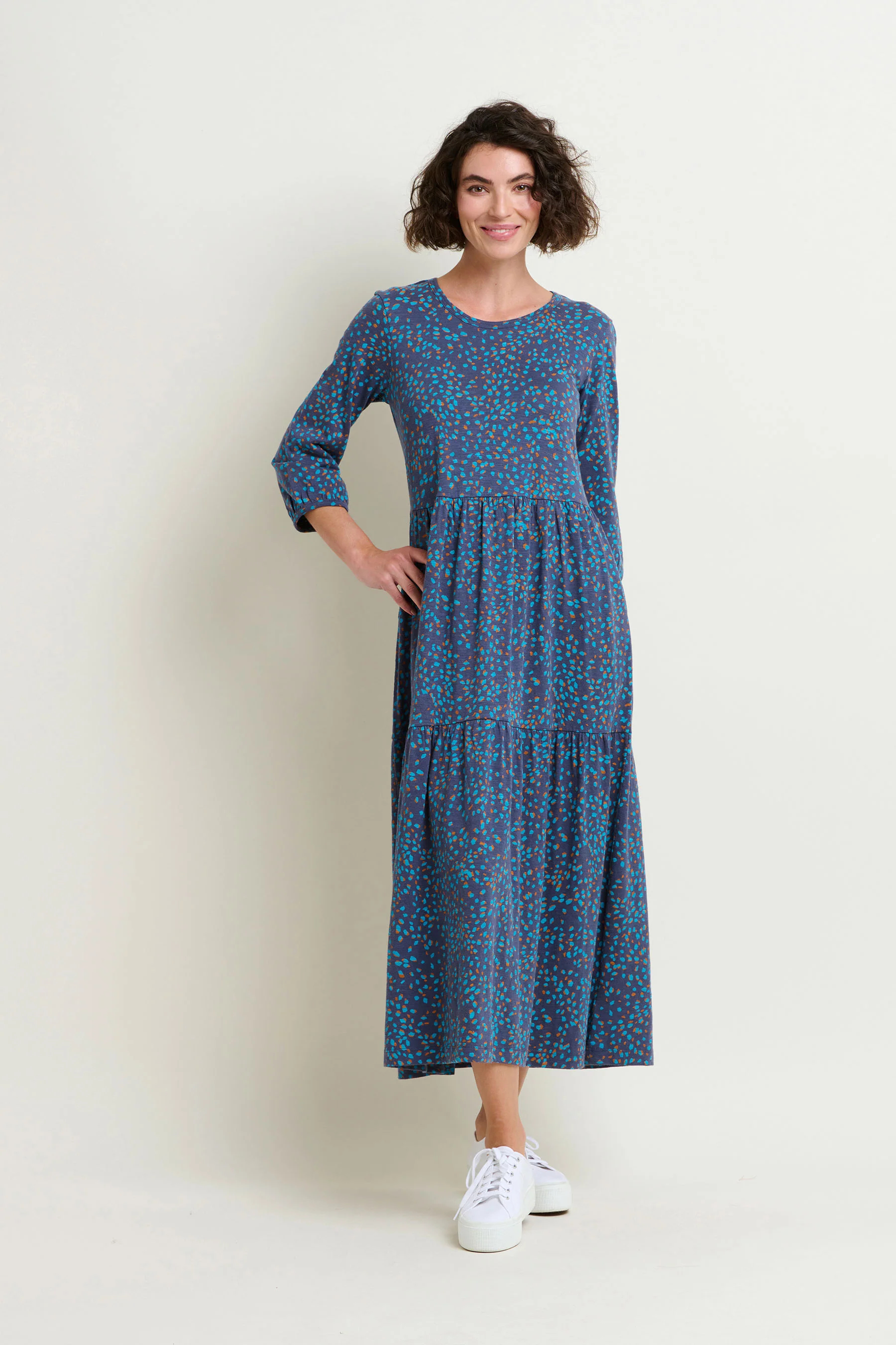 A wardrobe staple for good reason, this tiered blue maxi dress is perfect for everyday wear. A classic round neck, three quarter sleeves, all-over stretch fabric and its contemporary abstract print all make for a versatile dress for those on the go. Features all-important pockets.