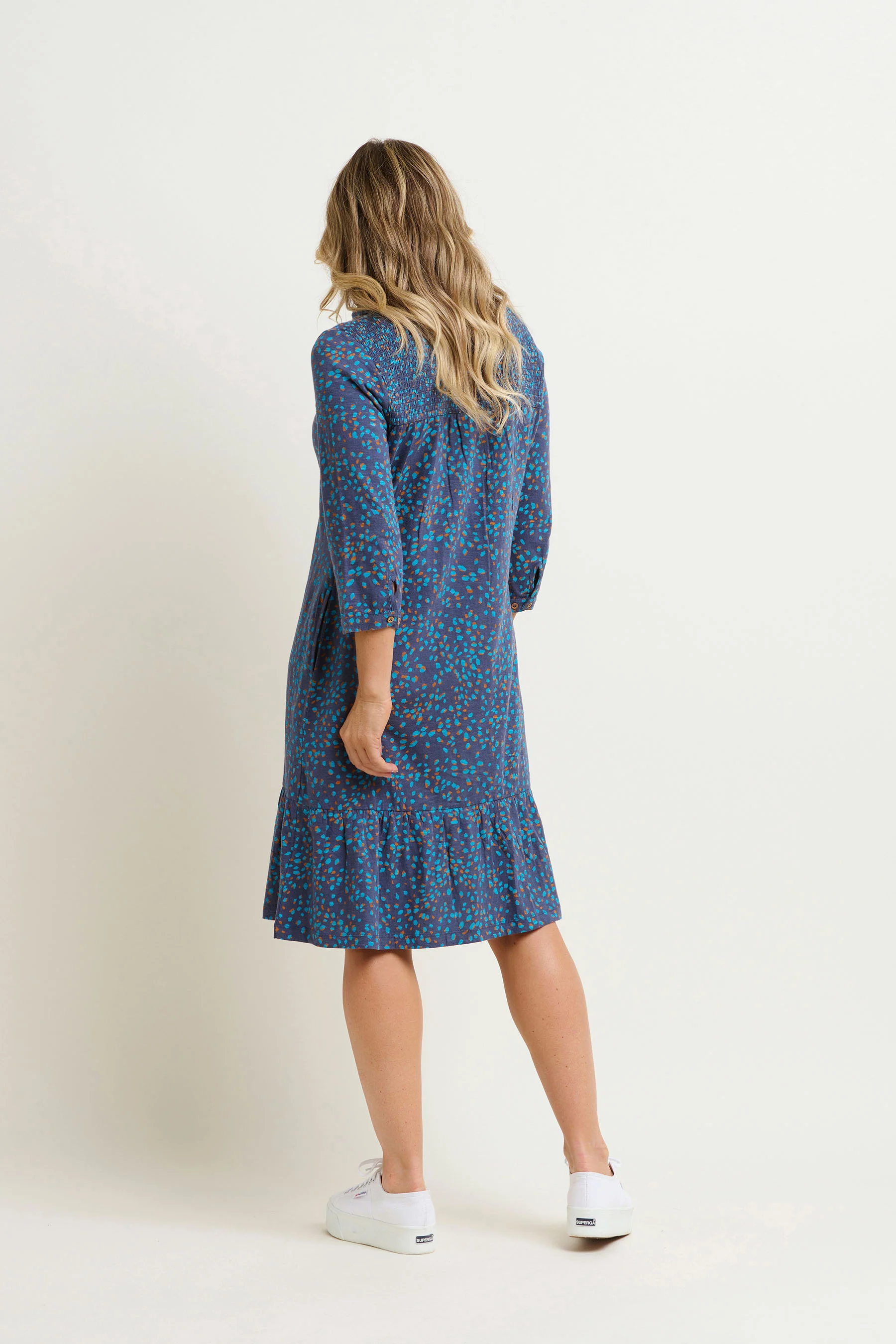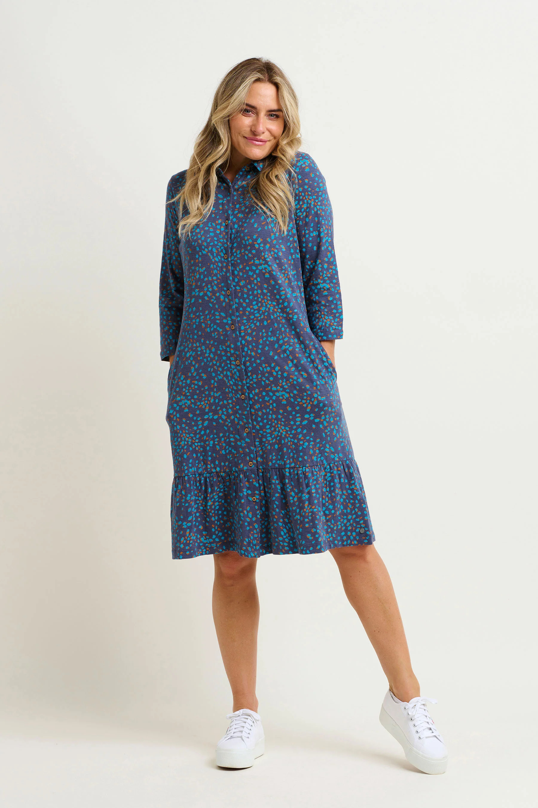 Add some glamour to your ordinary in this knee-length blue shirt dress. The contemporary abstract print will turn heads, while the shirt collar design, button detailing, and hem flounce make for a classic silhouette. Elasticated shirring across the yoke combined with all-over stretch fabric ensure the comfiest fit. Perfect for layering on chillier days.