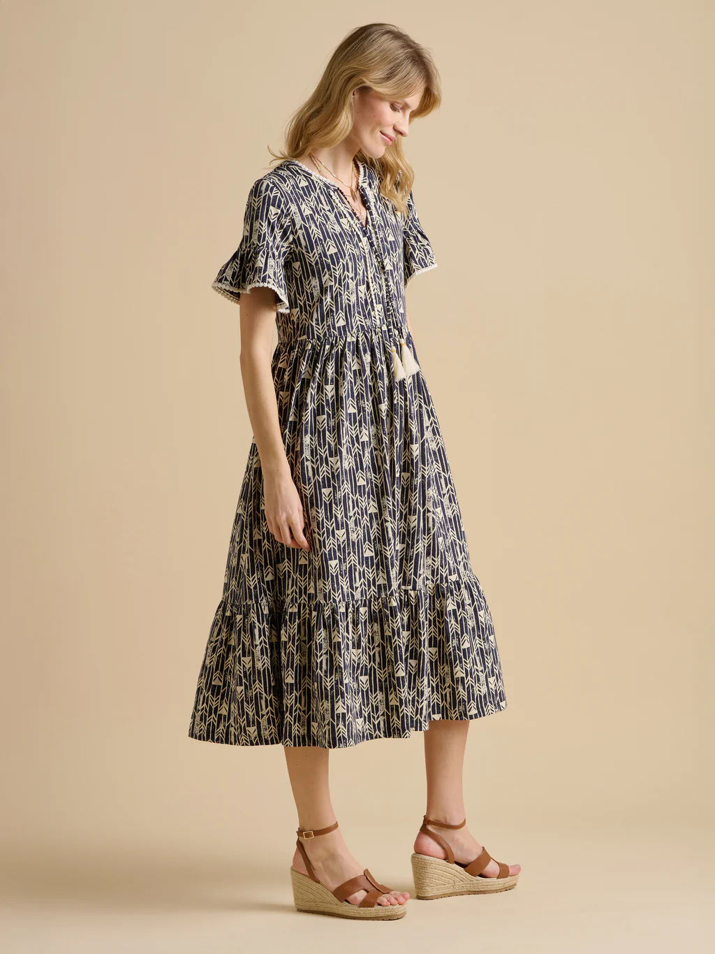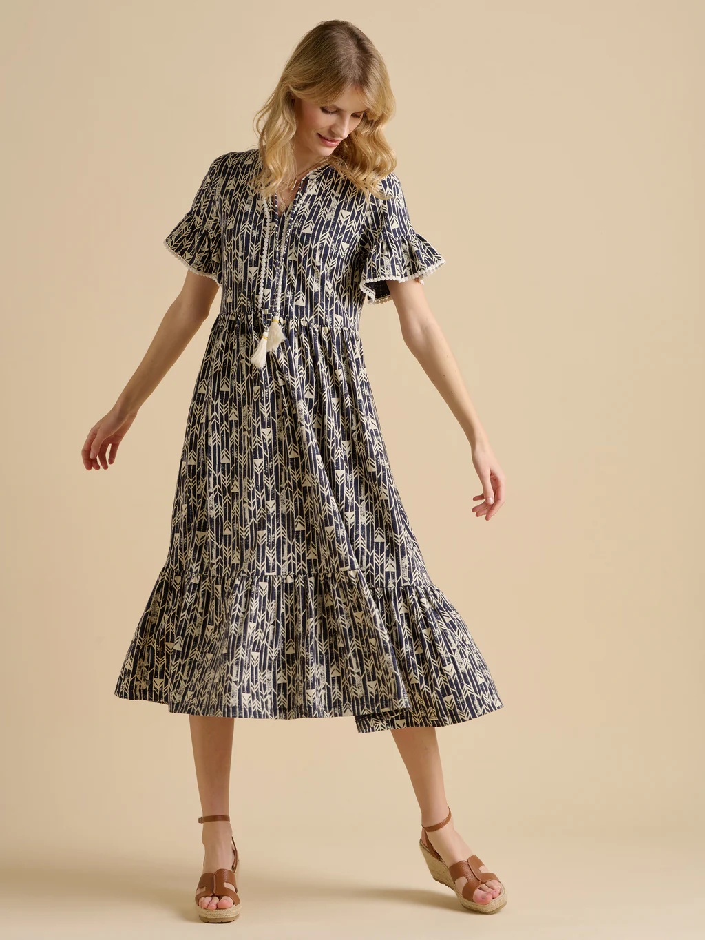 This striking statement dress will have heads turning. The smart monochrome fabric with feminine styling could be paired with a leather belt and sandals for a bold summer look. This midi dress also pays attention to every detail, with delicate trim and stylish neck tassels.