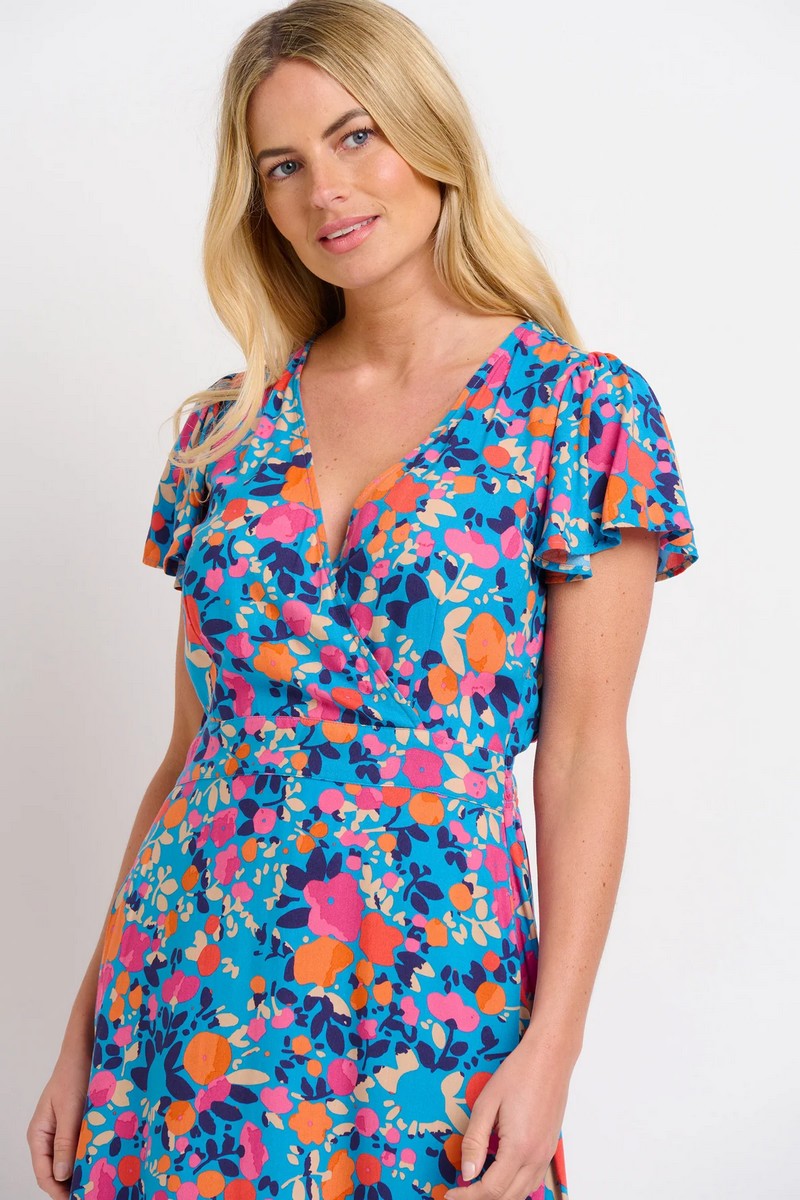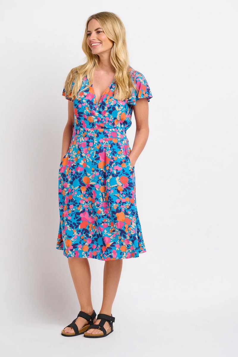 Turn heads in this bright, beautiful number with ‘butterfly’ floaty sleeves. It’s knee-length, has a flattering stretch-back waistband, pockets and a pretty crossover neckline.