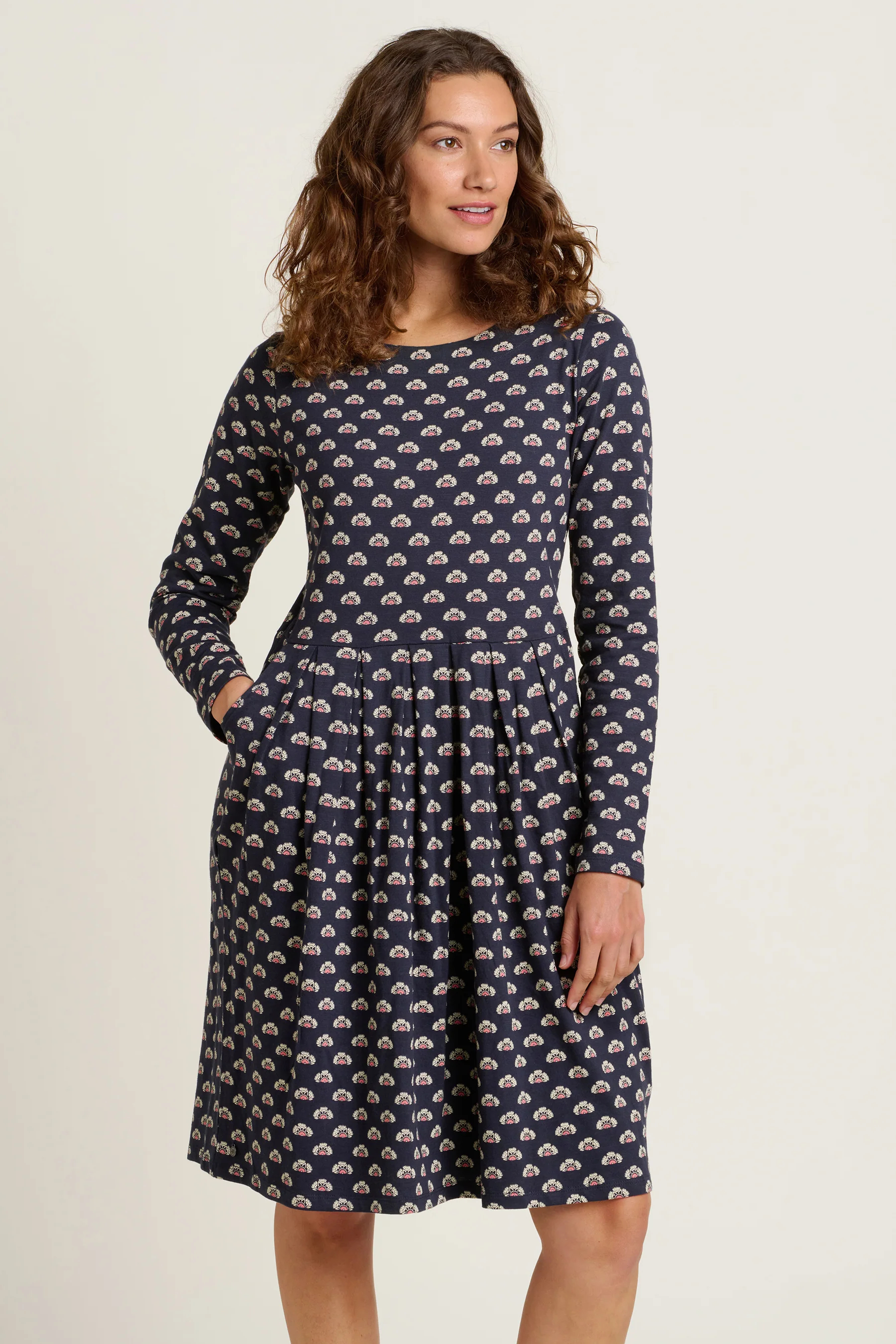 A navy patterned boat neck dress with sleeves is a comfortable wardrobe staple to see you through the cooler months. The Annie Dress by Brakeburn features a couple of pleats at the front and keyhole detailing at the back. Wear with leggings, boots and a denim jacket this season.