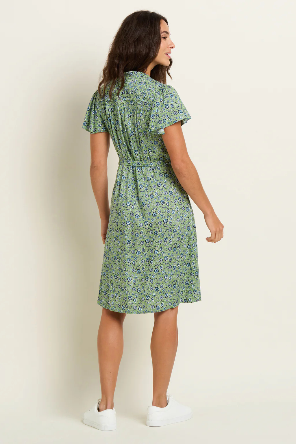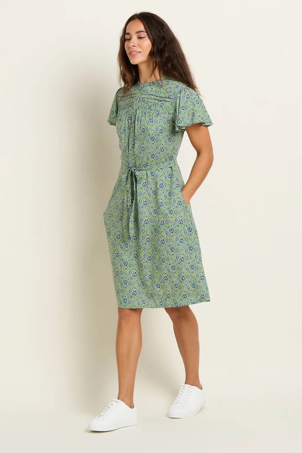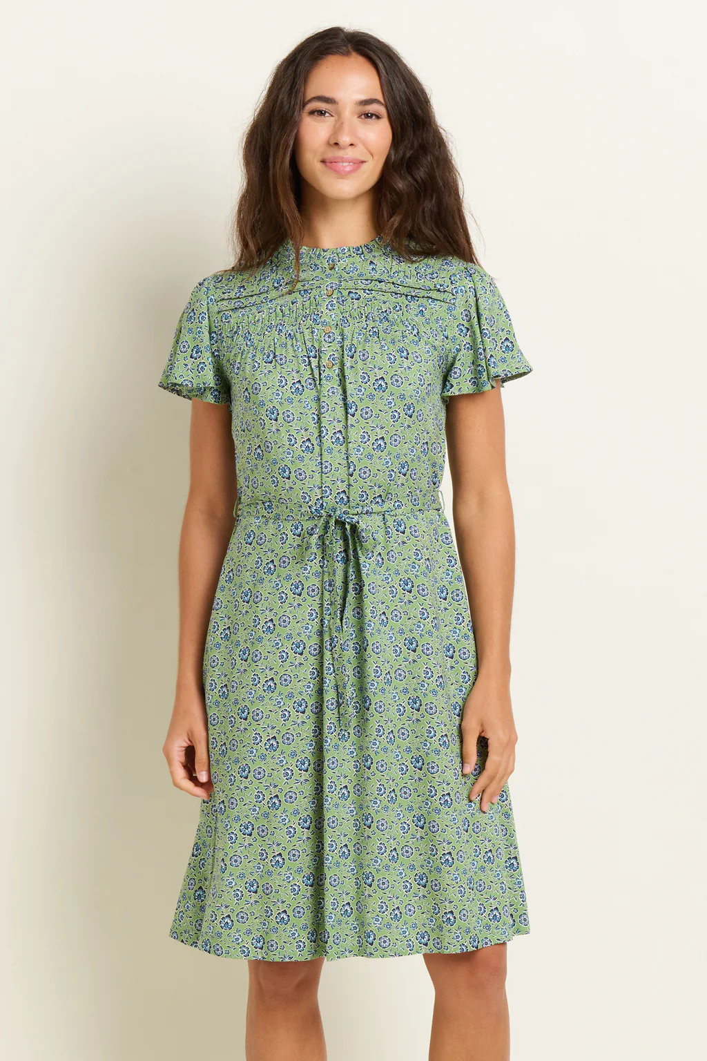 The Brakeburn Elsie dress is a knee-length, modern floral tea dress. Featuring a high neck, ruffle collar, pleated yoke and floaty fabric, the Elsie dress is flattering and lightweight for spring and summer. With pockets, a removable tie waist and delicate butterfly sleeves, the Elsie dress is pretty and practical. Wear with a lightweight cardi and sandals or heels and a cotton jacket for gatherings and special occasions.