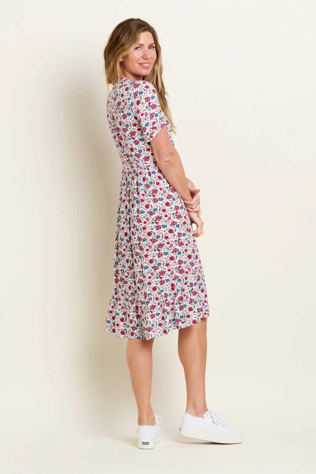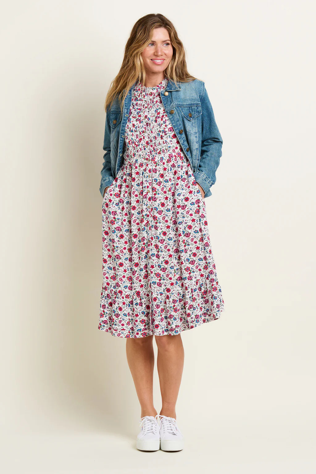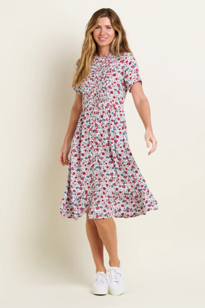 The Brakeburn Harper dress is a midi length, floral crinkle dress made with the warmer months in mind. It’s a flowy summer dress with delicate pintuck details, a round ruffle neck and wooden buttons from top to bottom. Its waist band, combined with a fit and flare skirt, makes it comfortable and stylish. Wear with your favourite sandals and a light pointelle knitted cardigan.