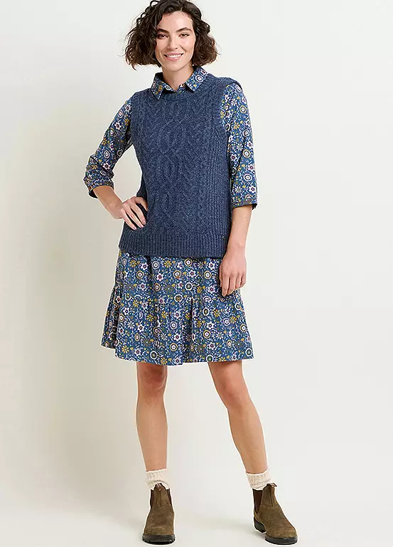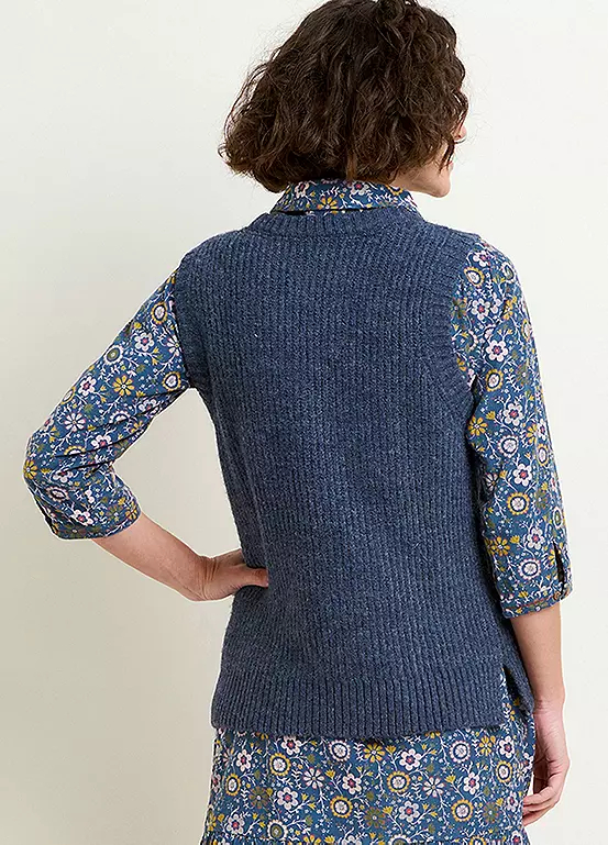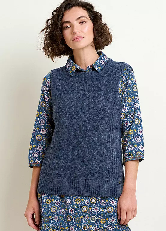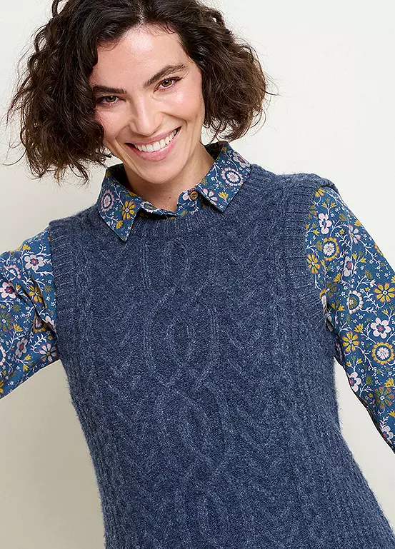 Change of season cosiness is the name of the game in this grey-blue cable knit tank top. With a relaxed body fit, the soft yarn, ribbed armholes, and hint of stretchy elastane all work together to create a truly comfortable wear. It’s also made using plastic bottles, so you can expand your wardrobe while being kind to the.