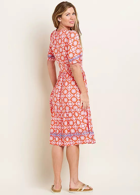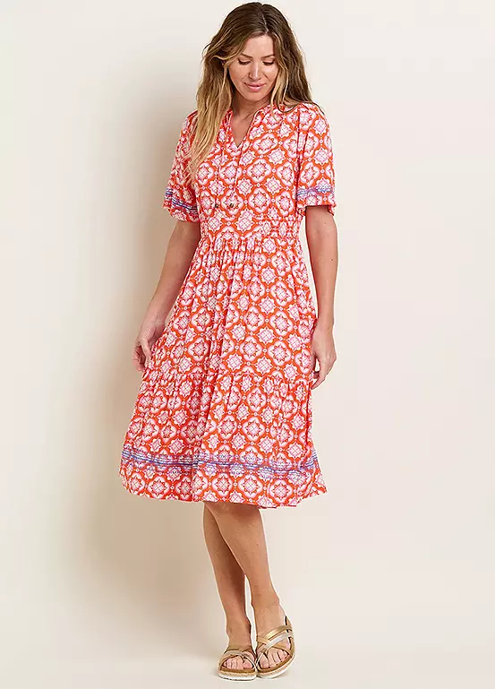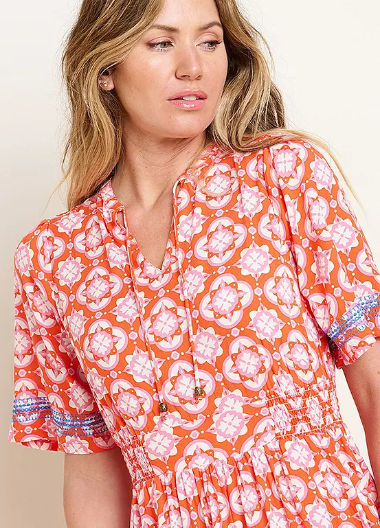 The Moroccan Tile midi is a patterned summer dress you just can’t miss. The vibrant pink and orange fabric, combined with a contrasting detailed machine embroidery, is eye-catching and fun. The soft, floaty fabric and notch neckline are comfortable to wear. The waistband and side shirring panels make for a fit that flatters. And, in true Brakeburn style, you’ll even find handy pockets stashed at the side.