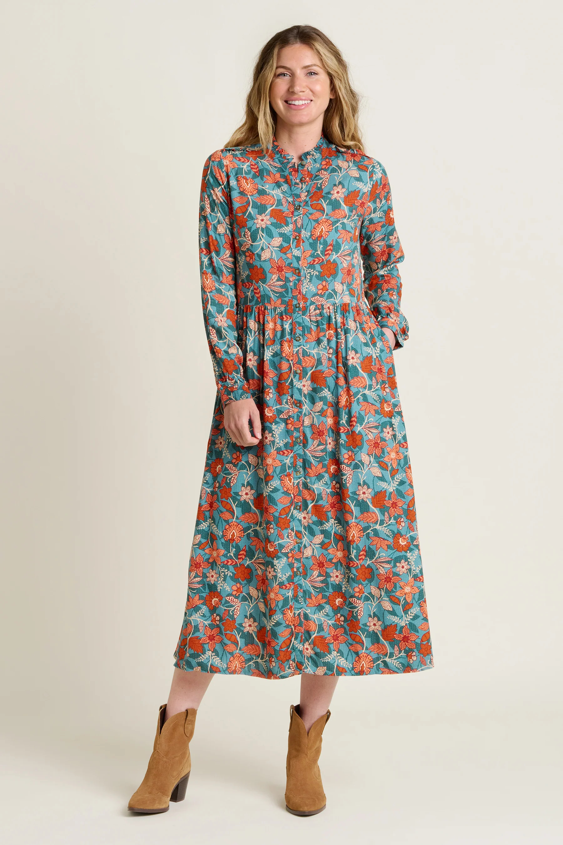 Say hello to the Brakeburn Ula, a bold, vintage-style floral maxi shirt dress you can wear every day. Its combination of peachy, teal tones, ruffle collar, full button up and gathers at the waist creates a flattering silhouette. Wear with chunky white trainers and a denim jacket for sunny autumn days or with a cardi or knitted vest and boots as the weather turns cooler.