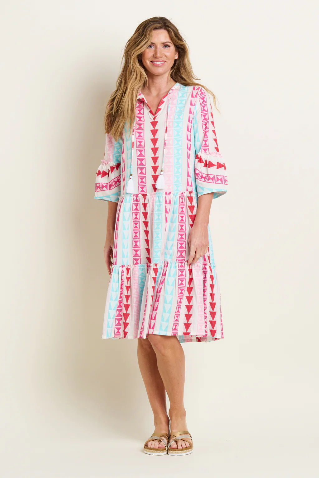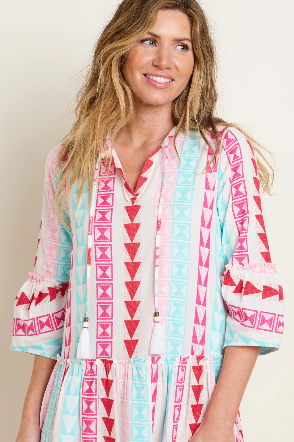 A geometric patterned, tiered midi dress designed with the summer in mind. The tassels, bow, and pom-pom trim add a layer of detail, while the loose waist and tiered skirt provide room for movement. Ideal for relaxed evenings out or for spontaneous walks along the beach.
